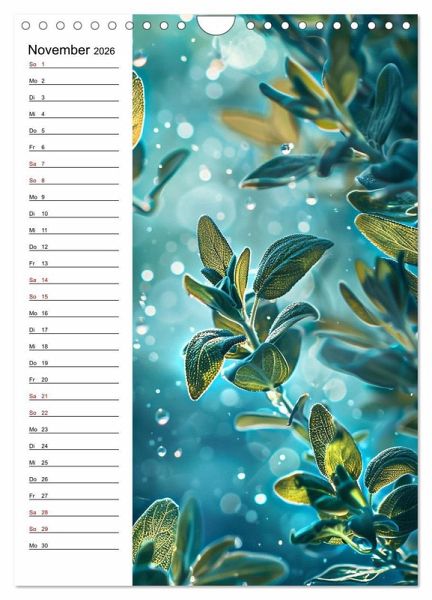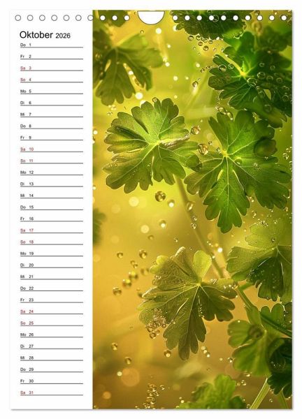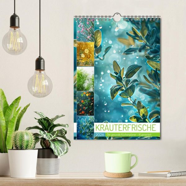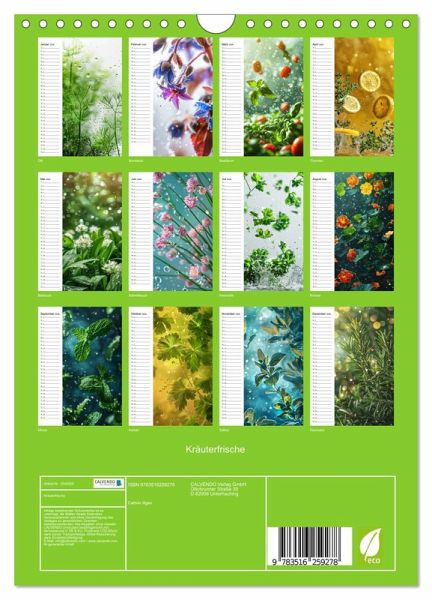 Der peppige Küchenplaner mit der absoluten Frische vieler Kräuter und Pflanzen für jede gelungene Mahlzeit. Mit dem großzügigen Organizer werden ganz sicher keine Termine mehr vergessen und die von einer künstlichen Intelligenz erstellten Fotos frischer Kräuter animieren gleichzeitig zum gesunden Kochen und bringen neue Ideen für das nächste Diner.