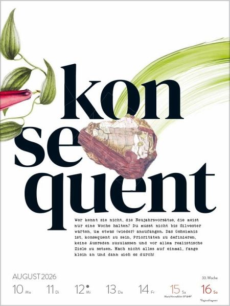 Achtsamkeit mal anders: 53 Worte laden ein zum Nachdenken, zum genau Hin-schauen und zum Mitnehmen durch die Woche. Starke Typografie rückt Woche für Woche ein Wort in den Fokus. Kurze Texte geben weitere Anregungen, werfen Fragen auf und deuten hin zu neuen Blickwinkeln. Dank passender Vintage-Elemente und Farb-Akzente ist dieser Wochenkalender nicht nur inhaltlich kraftvoll, sondern auch ein visuelles Highlight. Klimaneutral hergestellt auf nachhaltig produziertem Papier.