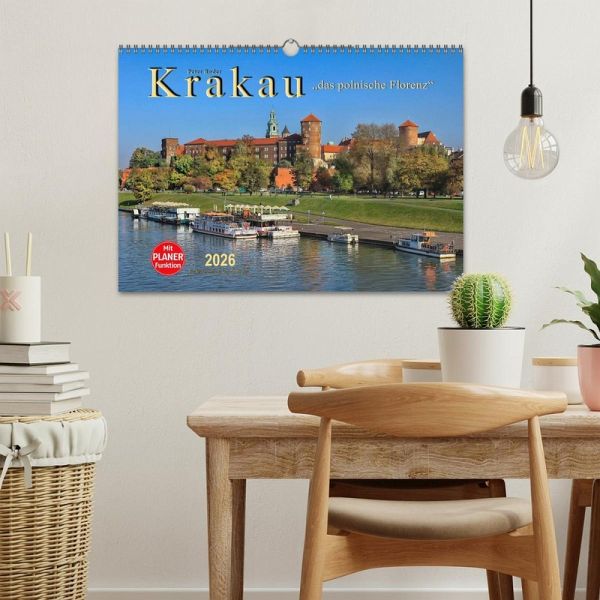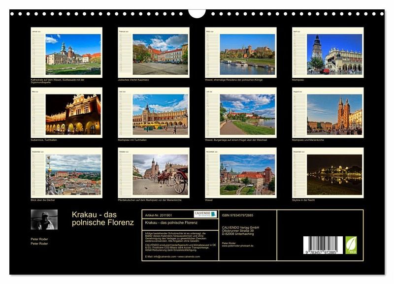 Krakau, Stadt voller Theater und Museen, geprägt durch ihre mittelalterliche Architektur und zahlreiche Kirchen, mit spektakulären Bauwerken in einer Altstadt, die schon seit 1978 zum UNESCO-Weltkulturerbe gehört. Krakau ist ein beliebtes Ziel für Touristen aus aller Welt, die neben der Altstadt und vielen weiteren Sehenswürdigkeiten auch den Wawel, die ehemalige Residenz der polnischen Könige, bestaunen können. Der riesige Bau über der Weichsel gehört ebenfalls zum UNESCO-Weltkulturerbe. Für diesen Planer hat der Fotokünstler Peter Roder zwölf wunderschöne Aufnahmen dieser einzigartigen Stadt zusammengestellt und gestaltet, ein zauberhafter Hingucker für das ganze Jahr.