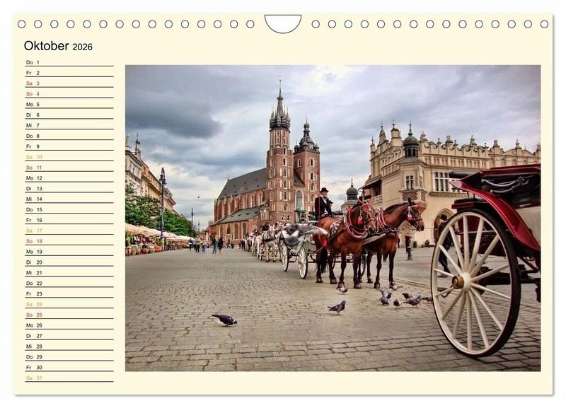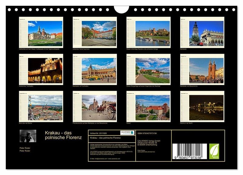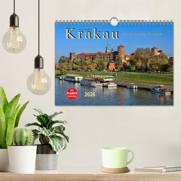 Krakau, Stadt voller Theater und Museen, geprägt durch ihre mittelalterliche Architektur und zahlreiche Kirchen, mit spektakulären Bauwerken in einer Altstadt, die schon seit 1978 zum UNESCO-Weltkulturerbe gehört. Krakau ist ein beliebtes Ziel für Touristen aus aller Welt, die neben der Altstadt und vielen weiteren Sehenswürdigkeiten auch den Wawel, die ehemalige Residenz der polnischen Könige, bestaunen können. Der riesige Bau über der Weichsel gehört ebenfalls zum UNESCO-Weltkulturerbe. Für diesen Planer hat der Fotokünstler Peter Roder zwölf wunderschöne Aufnahmen dieser einzigartigen Stadt zusammengestellt und gestaltet, ein zauberhafter Hingucker für das ganze Jahr.