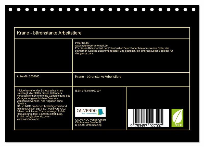 QUALITÄT - Hochwertiger Fotokalender mit 12 wunderschönen Motiven auf lichtbeständigem Bilderdruckpapier, robuste Spiralbindung.NACHHALTIG - deutliche Abfallreduzierung durch bedarfsgerechte Einzelstückfertigung, umweltfreundliches FSC-zertifiziertes Papier, Produktion in Deutschland, klimabewusste Logistik.PERFEKTES GESCHENK - Kalender für Freunde und Familie, für Kinder und Erwachsene, jung und alt, zu Weihnachten, Geburtstag oder zwischendurch.VIELFALT - Bildkalender in verschiedenen Formaten, z.B. DIN A5, DIN A4, DIN A3 sowie DIN A2. Ob Naturmotiv, Gemälde oder Fotos, ideal für ein persönliches Wohlfühlambiente.Krane, imposante Stahlgiganten mit enormer Tragkraft. von Autor(in): Peter Roder