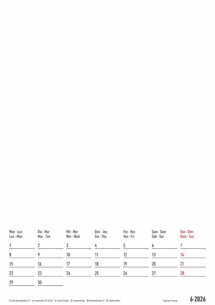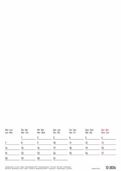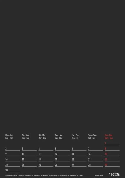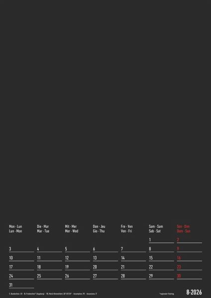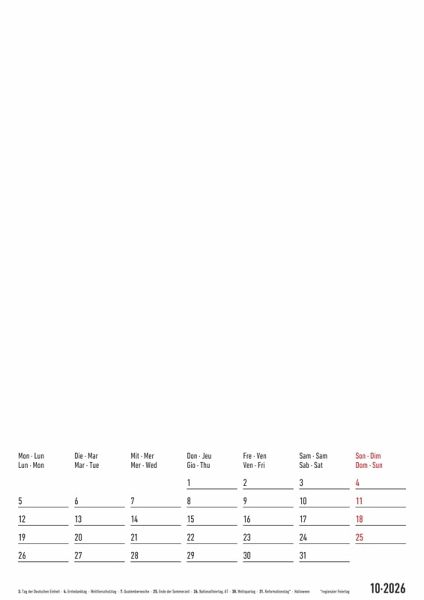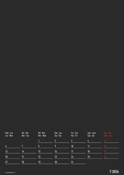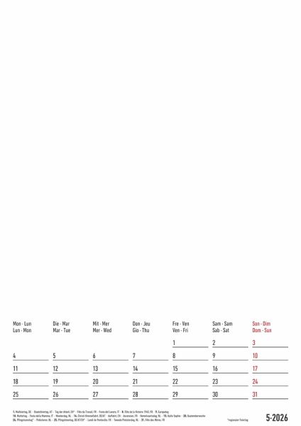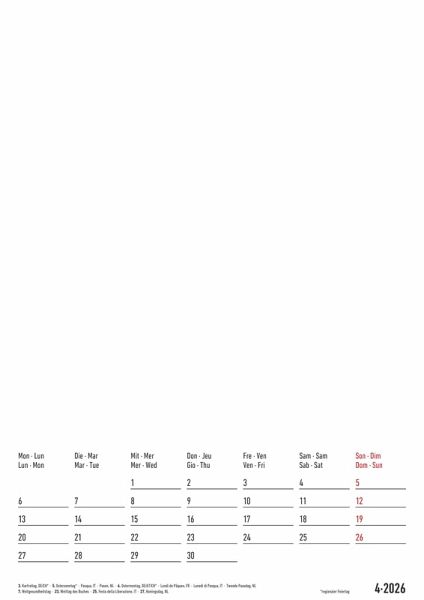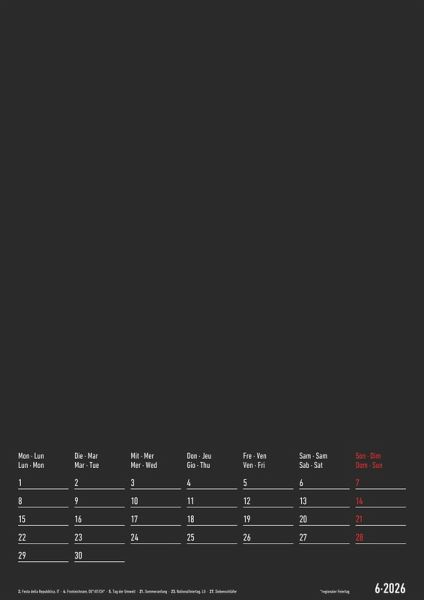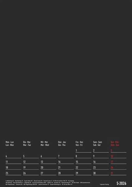Ansprechendes Design: 2-in-1-Kalender mit wahlweise schwarzem oder weißem Hintergrund für kreative Gestaltungsideen mit gestaltbarem Titelblatt Umfassende Organisation: Datierter Bastelkalender mit täglichem Platz für kurze Notizen und übersichtlichem KalendariumFlexibel gestaltbar: Ideal für Fotos (bis 18×13 cm bzw. 13×18 cm), Zeichnungen oder CollagenInternational nutzbar: 4-sprachiges Kalendarium (DE/FR/IT/GB) mit Feiertagen (DE/AT/CH/FR/IT)Handliches Format: DIN A4 (21×29,7 cm) mit stabiler Spiralbindung perfekt zum Aufhängen und Umblättern