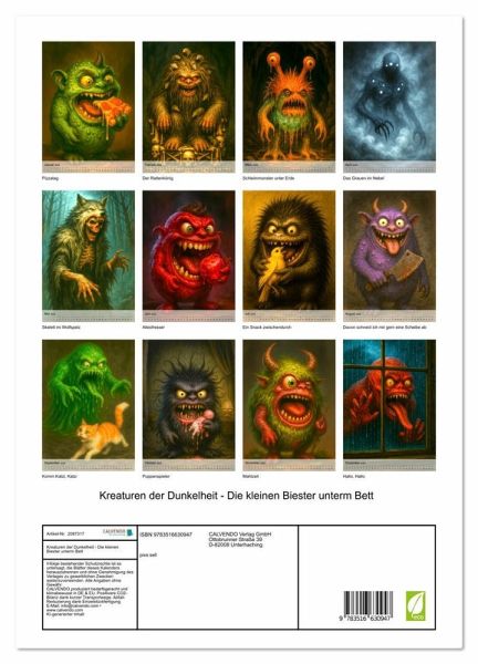 PREMIUM-LINIE - Brillanter Fotokalender mit 12 wunderschönen Motiven, Kunstdruck in Hochglanz in Museumsqualität.QUALITÄT - edle Materialien, stabile Rückwand mit 2 innovativen Einstecktaschen für eine optimale Präsentation an der Wand.NACHHALTIG - deutliche Abfallreduzierung durch bedarfsgerechte Einzelstückfertigung, umweltfreundliches FSC-zertifiziertes Papier, Produktion in Deutschland, klimabewusste Logistik.PERFEKTES GESCHENK - Kalender für Freunde und Familie, für Kinder und Erwachsene, jung und alt, zu Weihnachten, Geburtstag oder zwischendurch.Ein gruseliger Monsterkalender, zeigt Ihnen Kreaturen der Dunkelheit, fürs ganze Jahr. von Autor(in): Fabian Junge