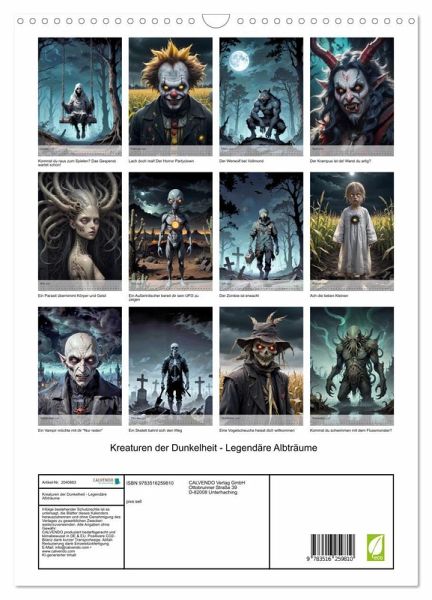 QUALITÄT - Hochwertiger Fotokalender mit 12 wunderschönen Motiven auf lichtbeständigem Bilderdruckpapier, robuste Spiralbindung mit Aufhängebügel.NACHHALTIG - deutliche Abfallreduzierung durch bedarfsgerechte Einzelstückfertigung, umweltfreundliches FSC-zertifiziertes Papier, Produktion in Deutschland, klimabewusste Logistik.PERFEKTES GESCHENK - Kalender für Freunde und Familie, für Kinder und Erwachsene, jung und alt, zu Weihnachten, Geburtstag oder zwischendurch.VIELFALT - Bildkalender in verschiedenen Formaten, z.B. DIN A5, DIN A4, DIN A3 sowie DIN A2. Ob Naturmotiv, Gemälde oder Fotos, ideal für ein persönliches Wohlfühlambiente.Ein düsterer Kalender, der legendäre Albträume entfesselt, indem er Kreaturen der Dunkelheit in ihrer schaurigsten Gestalt präsentiert. von Autor(in): Fabian Junge