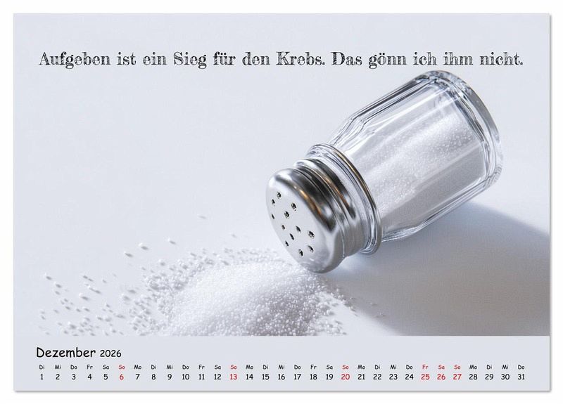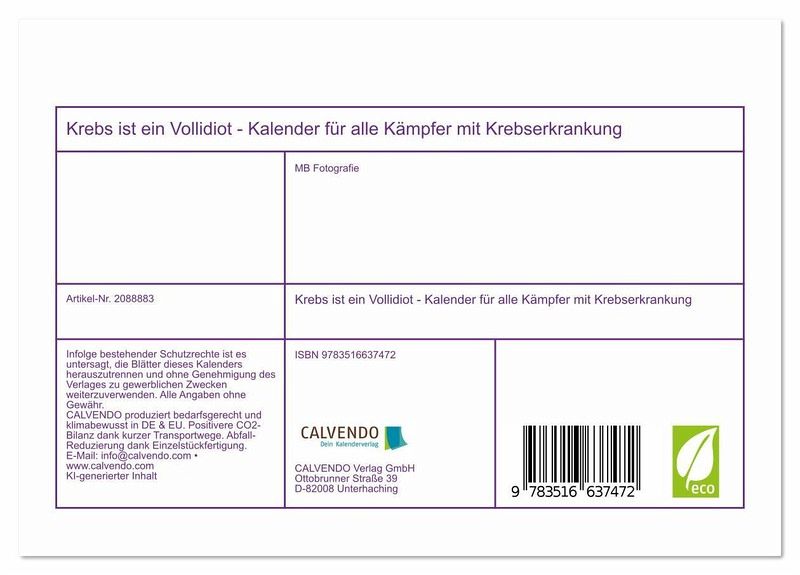 Ein einzigartiger Krebs Kalender, der Krebskranke und ihre Angehörigen mit Mut, Lebensfreude und Hoffnung begleitet. Ideal als Geschenk bei Krebserkrankung, bringt er mit starken Bildern und kraftvollen Krebs Sprüchen Motivation in jeden Monat. Ob als Geschenk für Krebspatienten, Krebspatientinnen oder als Glücksbringer in schweren Zeiten - dieser mit KI-generierte Motivationskalender zeigt, dass man auch mit Krebs weiterkämpfen kann. Mit viel Gefühl, Mut und einem Hauch Humor begleitet er durch die Krebsbewältigung und spricht direkt zu Herzen. Für alle, die mit der Krankheit Krebs kämpfen, Krebszellen trotzen und nie aufgeben! Ein inspirierender Begleiter für Menschen mit Krebserkrankung, die Kraft tanken und weitergehen wollen. Ihr seid stark. Ihr seid mutig. Ihr seid nicht allein!