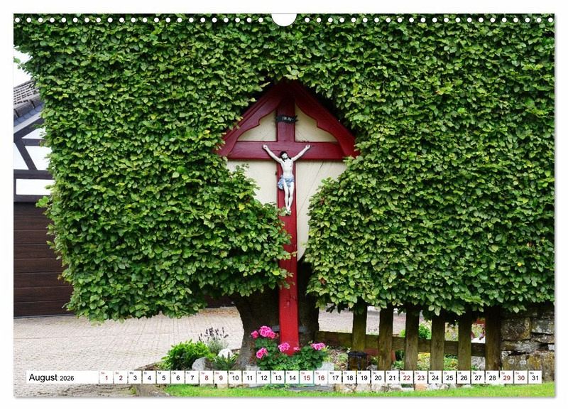 Juli: Hecken sind wie Kunstwerke im Monschauer Land, und in Verbindung mit einem Kreuz ein schöner Blickfang.