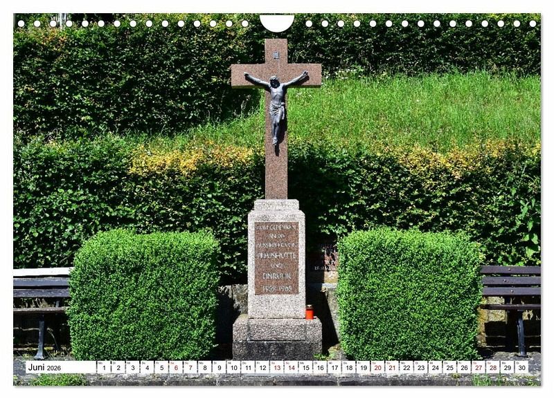 Juli: Hecken sind wie Kunstwerke im Monschauer Land, und in Verbindung mit einem Kreuz ein schöner Blickfang.