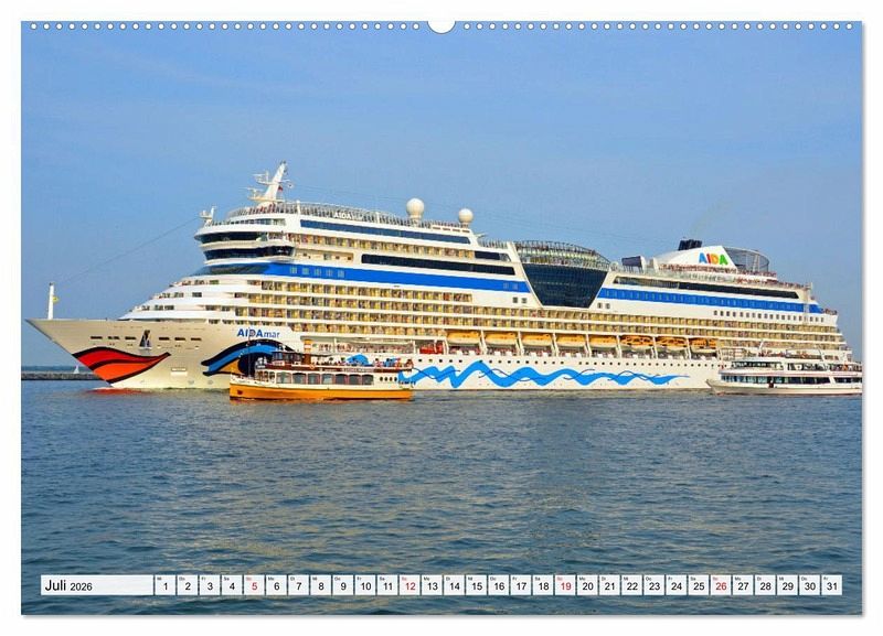 Juli: Die "AIDAmar", Länge. 253 m, Breite: 32 m, 71 000 BRZ, Flagge: Italien, Passagiere: 2686, Crew: 611, Indienststellung: 2012