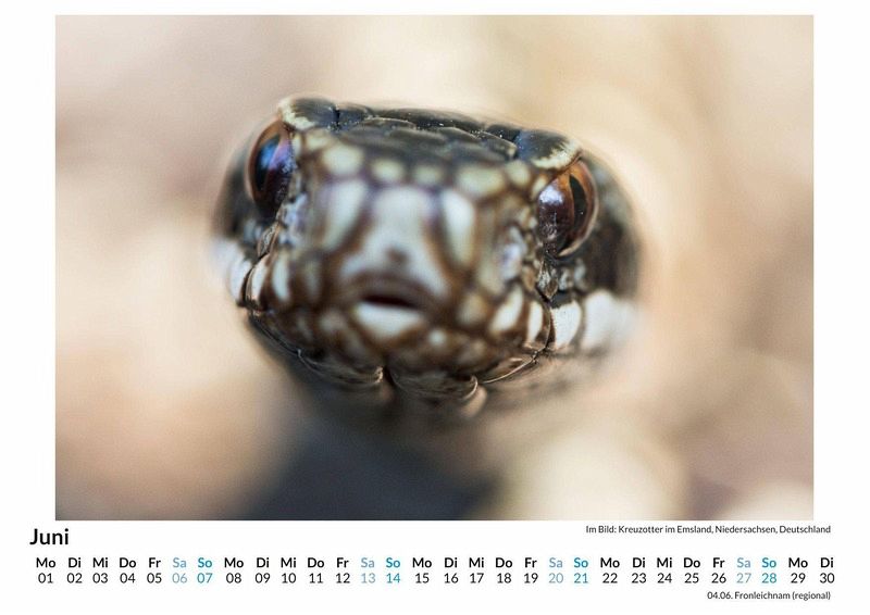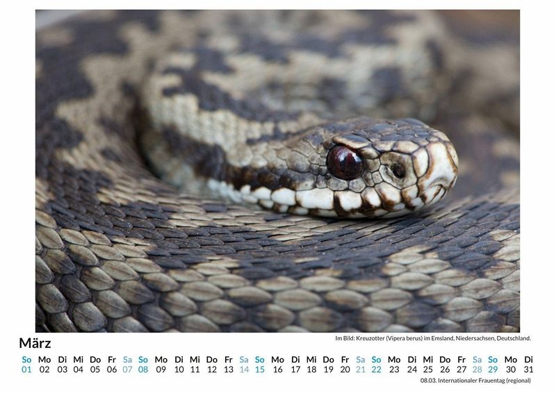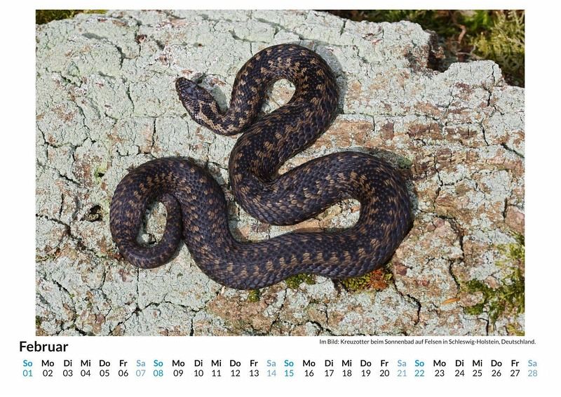 Entdecken Sie die faszinierende Welt der Kreuzotter mit unserem hochwertigen Wandkalender! Dieser Kalender zeigt 12 beeindruckende Motive der scheuen und zugleich majestätischen Schlange, die in der Natur Europas heimisch ist. Jedes Bild wurde sorgfältig ausgewählt und auf lichtbeständigem Bilderdruckpapier in brillanten Farben gedruckt. Genießen Sie Monat für Monat die Schönheit dieser einzigartigen Reptilien. Gedruckt in Deutschland auf FSC-zertifiziertem Papier, vereint dieser Kalender Nachhaltigkeit und Ästhetik. Perfekt für Natur- und Tierliebhaber - holen Sie sich ein Stück Wildnis in Ihr Zuhause! Ideal auch als Geschenk für Reptilien-Fans. Hochwertig Erleben Sie ein Jahr voller Eleganz mit unserem Premium-Fotokalender. Jedes der 12 Motive ist auf hochwertigem, lichtbeständigem Bilderdruckpapier gedruckt, um die Lebendigkeit jedes Bildes zu bewahren. Die robuste Spiralbindung gewährleistet Langlebigkeit und einfache Handhabung. Nachhaltig Unser Engagement für die Umwelt spiegelt sich in jedem Exemplar wider. Durch die Produktion auf Abruf reduzieren wir signifikant unseren Abfall. Wir verwenden ausschließlich umweltfreundliches, FSC-zertifiziertes Papier. Stolz gefertigt in Deutschland, achten wir bei unserer Logistik auf Klimaschutz, um unseren ökologischen Fußabdruck zu minimieren. Das ideale Geschenk Dieser Kalender ist das perfekte Präsent für jeden Anlass - ob Weihnachten, Geburtstage oder einfach als liebevolle Aufmerksamkeit zwischendurch. Geeignet für Freunde, Familie, Kinder und Erwachsene gleichermaßen, bereichert er jedes Zuhause mit seiner Vielfalt und Schönheit, unabhängig vom Alter der Beschenkten.