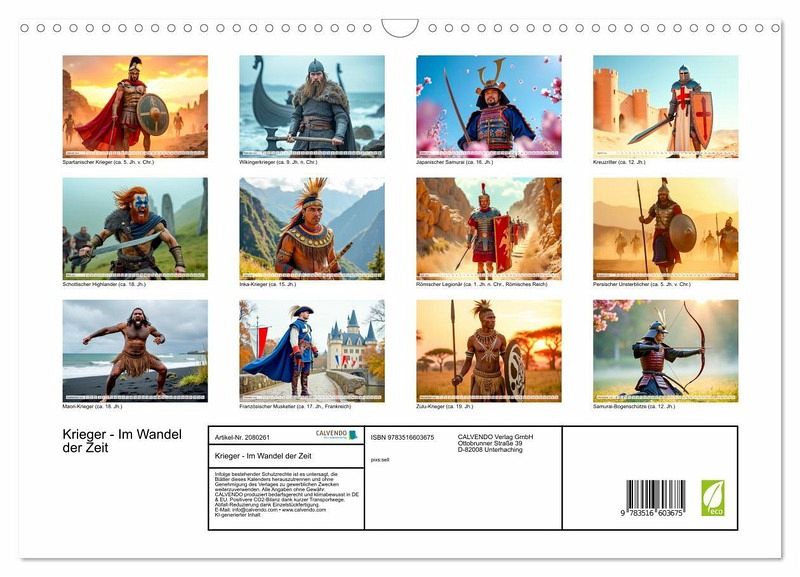 QUALITÄT - Hochwertiger Fotokalender mit 12 wunderschönen Motiven auf lichtbeständigem Bilderdruckpapier, robuste Spiralbindung mit Aufhängebügel.NACHHALTIG - deutliche Abfallreduzierung durch bedarfsgerechte Einzelstückfertigung, umweltfreundliches FSC-zertifiziertes Papier, Produktion in Deutschland, klimabewusste Logistik.PERFEKTES GESCHENK - Kalender für Freunde und Familie, für Kinder und Erwachsene, jung und alt, zu Weihnachten, Geburtstag oder zwischendurch.VIELFALT - Bildkalender in verschiedenen Formaten, z.B. DIN A5, DIN A4, DIN A3 sowie DIN A2. Ob Naturmotiv, Gemälde oder Fotos, ideal für ein persönliches Wohlfühlambiente.Ein KI-Kalender, der die Vielfalt historischer Krieger in starken Bildern interpretiert. von Autor(in): Fabian Junge