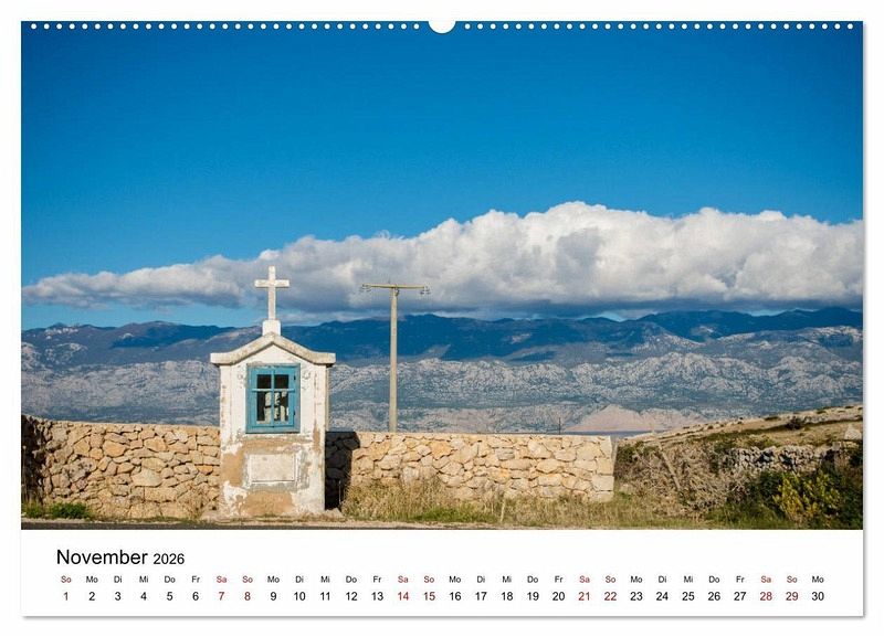 November: Wegschrein auf der Insel Pag mit Blick auf die Velebiten