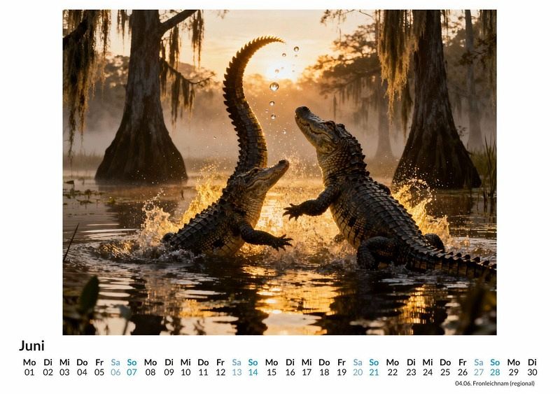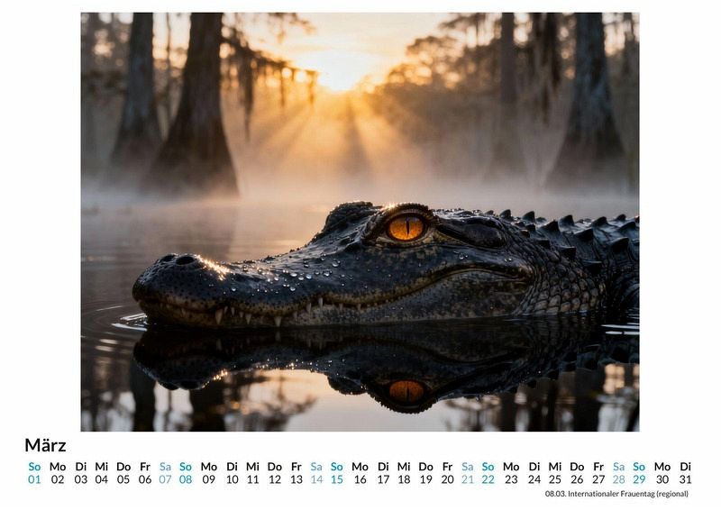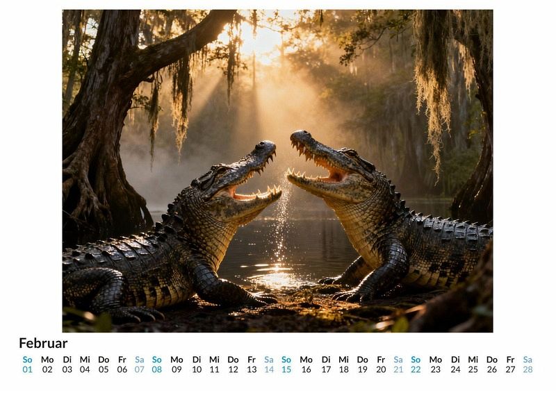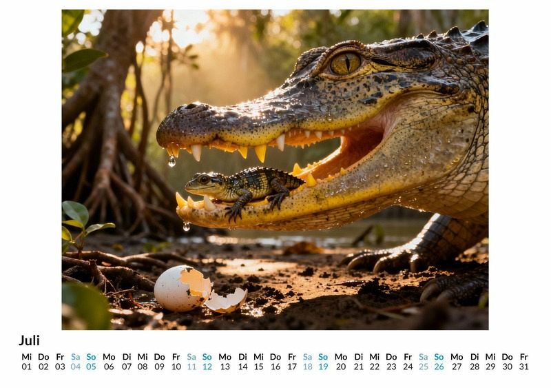 Seit Millionen von Jahren durchstreifen sie die Gewässer unseres Planeten. Ihre gepanzerten Körper und ihr lauernder Blick sind das Ergebnis einer perfekten Anpassung, die Jahrmillionen überdauert hat. Der Kalender "Krokodil & Alligator" widmet sich diesen faszinierenden prähistorischen Jägern und ihrer ungebrochenen Herrschaft in den Flüssen und Sümpfen der Welt. Dieser Kalender ist optimal geeignet: * Für alle, die sich für Reptilien und die Tierwelt begeistern. * Für Liebhaber von prähistorischen Themen und urzeitlichen Lebewesen. * Für jene, die eine außergewöhnliche Wanddekoration mit eindrucksvollen Motiven suchen. Jedes der zwölf Monatsmotive zeigt die Panzerechsen in ihrer natürlichen Umgebung. Die Szenen, die diese urzeitlichen Jäger in Aktion und in Momenten der Ruhe darstellen, wurden aus einer Fülle von visuellen Informationen digital zu neuen Kompositionen zusammengefügt. Mal sieht man sie regungslos am Ufer liegen, mal durchbrechen sie mit Wucht die Wasseroberfläche. Die Motive fangen die rohe Energie und die stille Geduld dieser Spezies ein und unterstreichen ihre kraftvolle Präsenz. Beim Kauf dieses Kalenders kann man Folgendes erwarten: * Zwölf Monatsblätter mit Motiven von Krokodilen und Alligatoren. * Ein übersichtliches Kalendarium für die gesamte Jahresplanung. * Einblicke in die Lebensweise der beeindruckenden Panzerechsen. Der Kalender "Krokodil & Alligator" ist eine Hommage an die Ausdauer und die urtümliche Kraft dieser Tiere. Er ist eine tägliche Erinnerung an die ungezähmte Natur und ihre ältesten Überlebenden. Eine Entdeckungsreise durch die Monatsmotive lädt dazu ein, sich von diesen urzeitlichen Jägern durch das Jahr begleiten zu lassen.