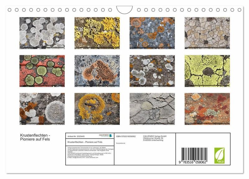 QUALITÄT - Hochwertiger Fotokalender mit 12 wunderschönen Motiven auf lichtbeständigem Bilderdruckpapier, robuste Spiralbindung mit Aufhängebügel.NACHHALTIG - deutliche Abfallreduzierung durch bedarfsgerechte Einzelstückfertigung, umweltfreundliches FSC-zertifiziertes Papier, Produktion in Deutschland, klimabewusste Logistik.PERFEKTES GESCHENK - Kalender für Freunde und Familie, für Kinder und Erwachsene, jung und alt, zu Weihnachten, Geburtstag oder zwischendurch.VIELFALT - Bildkalender in verschiedenen Formaten, z.B. DIN A5, DIN A4, DIN A3 sowie DIN A2. Ob Naturmotiv, Gemälde oder Fotos, ideal für ein persönliches Wohlfühlambiente.Flechten, eine Symbiose aus Pilzen und Algen, sind Wegbereiter für die Besiedlung extremer Lebensräume mit Pflanzen und Tieren. von Autor(in): Rudolf Hofer