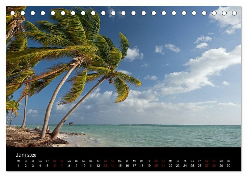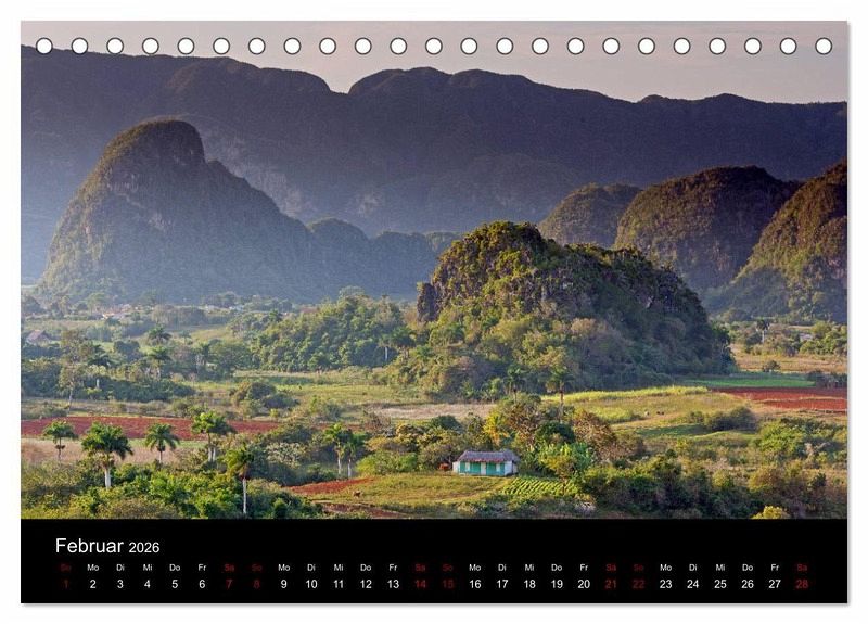 Der Kalender zeigt Kuba. Es wird die beeindruckende Kolonialarchitektur der Städte wie Trinidad, Sancti Spiritus oder Remedios gezeigt, ebenso wie die karibische Küste, die einzigartige Landschaft bei Vinales und die allgegenwärtigen amerikanischen Oldtimer.