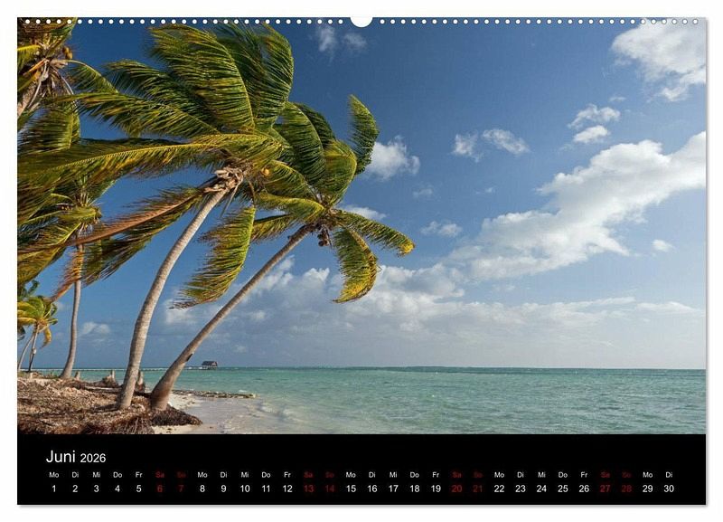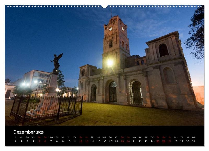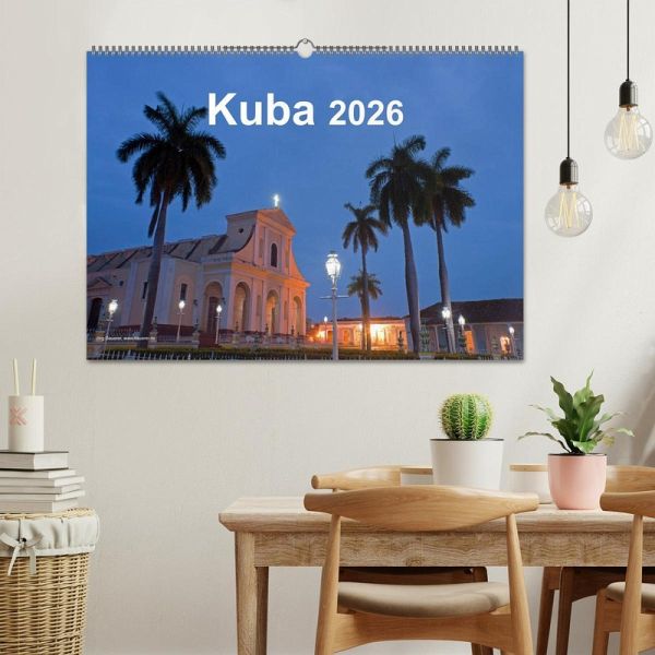 Der Kalender zeigt Kuba. Es wird die beeindruckende Kolonialarchitektur der Städte wie Trinidad, Sancti Spiritus oder Remedios gezeigt, ebenso wie die karibische Küste, die einzigartige Landschaft bei Vinales und die allgegenwärtigen amerikanischen Oldtimer.