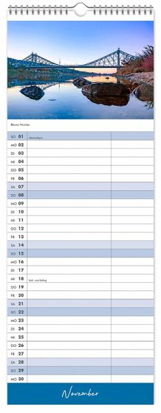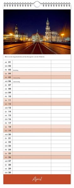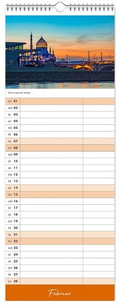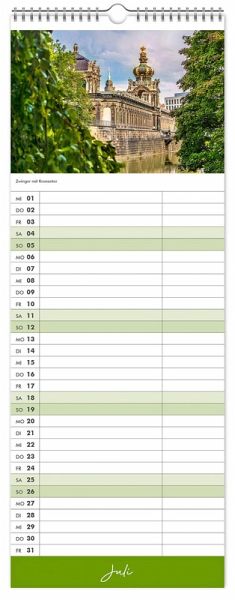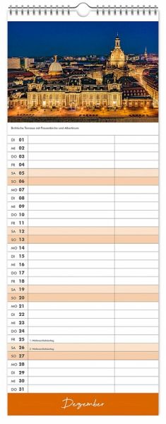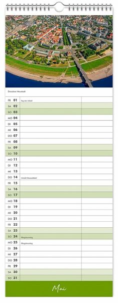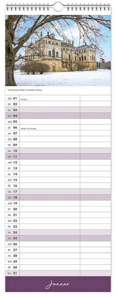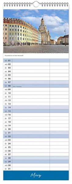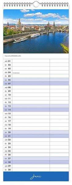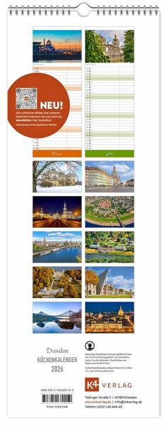 Küchenkalender Dresden 2026 Planer 15 x 40 cm Dieser Küchenkalender zeichnet sich auch 2026 wieder durch brillante Aufnahmen der Elbmetropole Dresden aus. Ergänzt wird er durch 2 Spalten zum Einschreiben für Ihre Termine, Notizen, Geburtstage etc.. Kalender Format 15 x 40 cm silberne Wire-O Bindung 250g/qm Premium Papier Deckblatt, 12 Monate, Rückseite Kalendarium 2026 mit 2 Spalten (z.Bsp. für Termine und Geburtstage) zum Einschreiben inkl. gesetzlicher Feiertage hochwertiger Digitaldruck starke Rückpappe gedruckt und produziert in Dresden