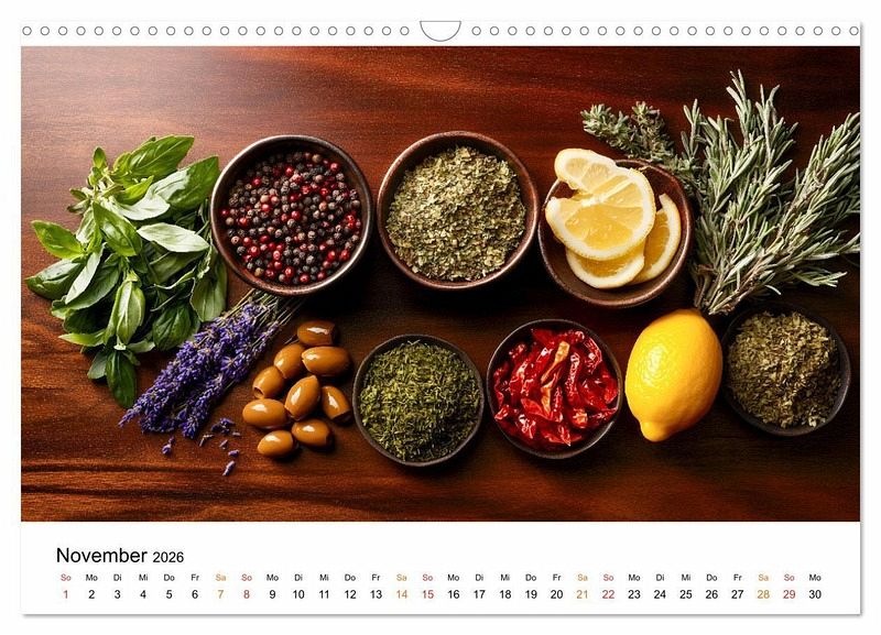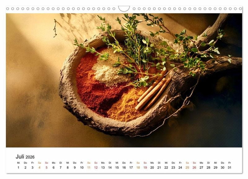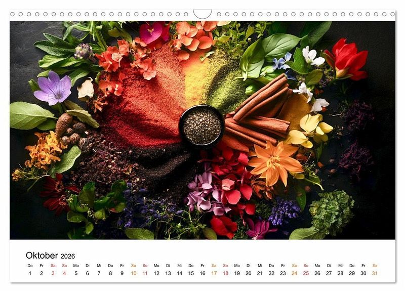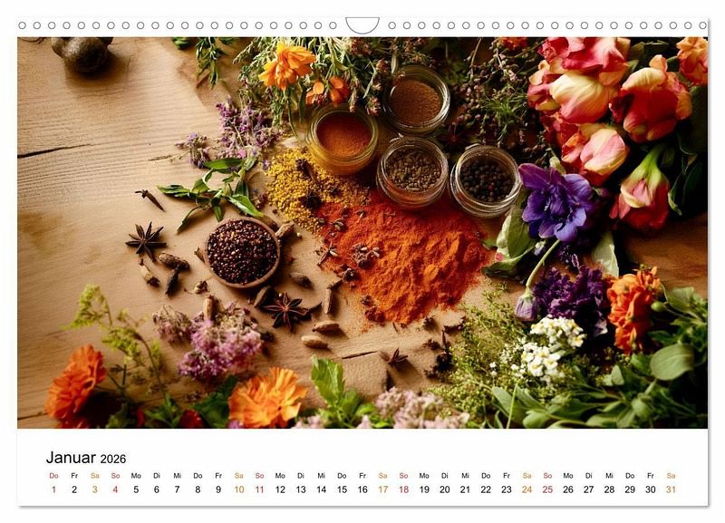 Lassen Sie sich jeden Monat aufs Neue verzaubern von einer farbenfrohen Reise durch die Welt der Aromen und Düfte. Diese liebevoll gestalteten KI-Bilder fangen die Magie fein gemahlener Gewürze, ganzer Körner und frischer Kräuter ein - perfekt inszeniert mit Lavendel, Rosmarin, Thymian und zarten Blüten. Die Kompositionen laden zum Träumen ein: Spüren Sie die Wärme des Orients, die Frische mediterraner Landschaften oder die florale Leichtigkeit des Sommers. Fast meint man, die Düfte riechen zu können, die diese Bilder in die Luft zaubern. Ein Muss für alle, die Geschmacksexplosionen, genussvolles Essen und das Besondere lieben.