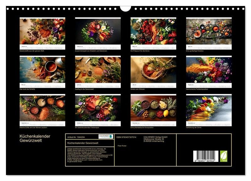 QUALITÄT - Hochwertiger Fotokalender mit 12 wunderschönen Motiven auf lichtbeständigem Bilderdruckpapier, robuste Spiralbindung mit Aufhängebügel.NACHHALTIG - deutliche Abfallreduzierung durch bedarfsgerechte Einzelstückfertigung, umweltfreundliches FSC-zertifiziertes Papier, Produktion in Deutschland, klimabewusste Logistik.PERFEKTES GESCHENK - Kalender für Freunde und Familie, für Kinder und Erwachsene, jung und alt, zu Weihnachten, Geburtstag oder zwischendurch.VIELFALT - Bildkalender in verschiedenen Formaten, z.B. DIN A5, DIN A4, DIN A3 sowie DIN A2. Ob Naturmotiv, Gemälde oder Fotos, ideal für ein persönliches Wohlfühlambiente.Eine farbenfrohe Reise durch die Welt der Aromen. von Autor(in): Peter Roder