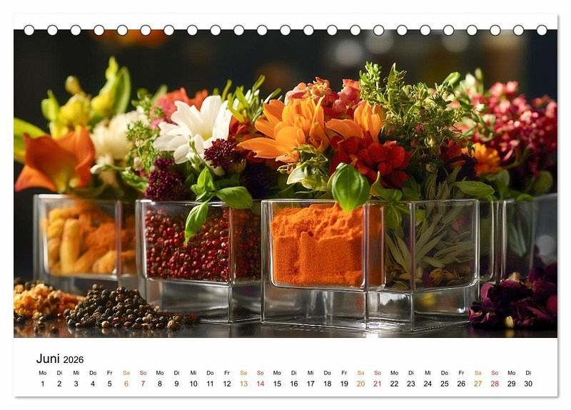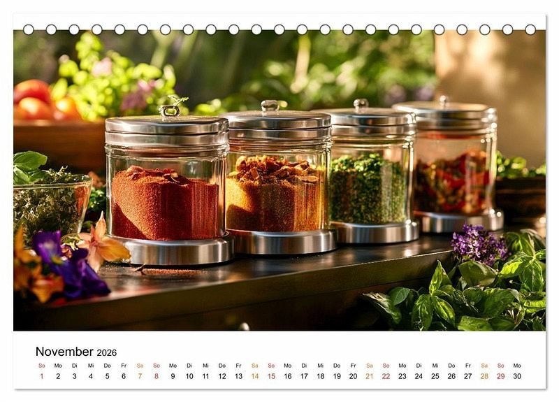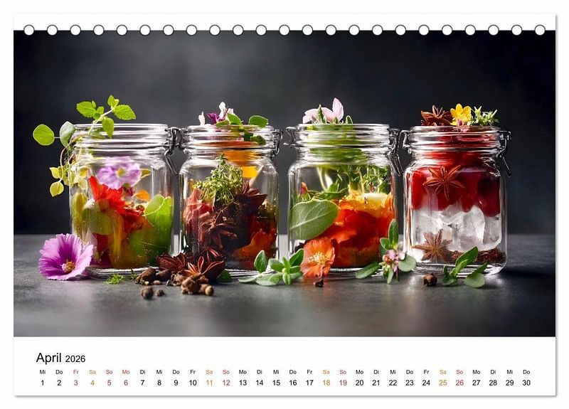 Tauchen Sie ein in die Welt der Aromen. Ob duftende Kräutersträuße, bunte Reihen exotischer Gewürze oder kunstvoll arrangiertes Gemüse mit farbenfrohen Blüten - dieser KI-Kalenders ist ein Fest für die Sinne. Jeden Monat erwartet Sie eine farbenfrohe Komposition aus wunderschönen Gläsern und jedes Gefäß ist ein kleines Kunstwerk, gefüllt mit einer Vielfalt an duftenden Gewürzen, frischen Kräutern und knackigem Gemüse - immer liebevoll arrangiert und dekoriert, mal mit zarten Blüten, mal in einer farbenprächtigen "Gläserreihe". Perfekt als Geschenk für Hobbyköche, Foodies und alle, die ihre Küche mit einem besonderen Hingucker bereichern möchten.