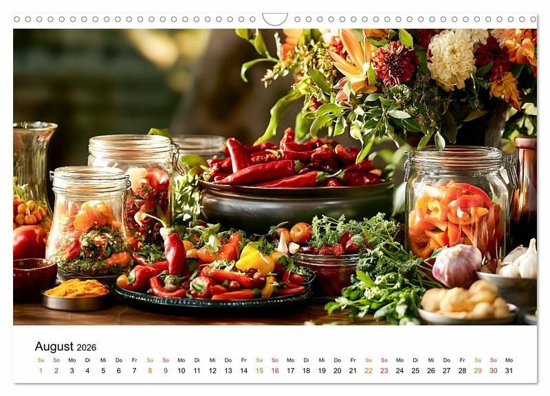 Tauchen Sie ein in die Welt der Aromen. Ob duftende Kräutersträuße, bunte Reihen exotischer Gewürze oder kunstvoll arrangiertes Gemüse mit farbenfrohen Blüten - dieser KI-Kalenders ist ein Fest für die Sinne. Jeden Monat erwartet Sie eine farbenfrohe Komposition aus wunderschönen Gläsern und jedes Gefäß ist ein kleines Kunstwerk, gefüllt mit einer Vielfalt an duftenden Gewürzen, frischen Kräutern und knackigem Gemüse - immer liebevoll arrangiert und dekoriert, mal mit zarten Blüten, mal in einer farbenprächtigen "Gläserreihe". Perfekt als Geschenk für Hobbyköche, Foodies und alle, die ihre Küche mit einem besonderen Hingucker bereichern möchten.