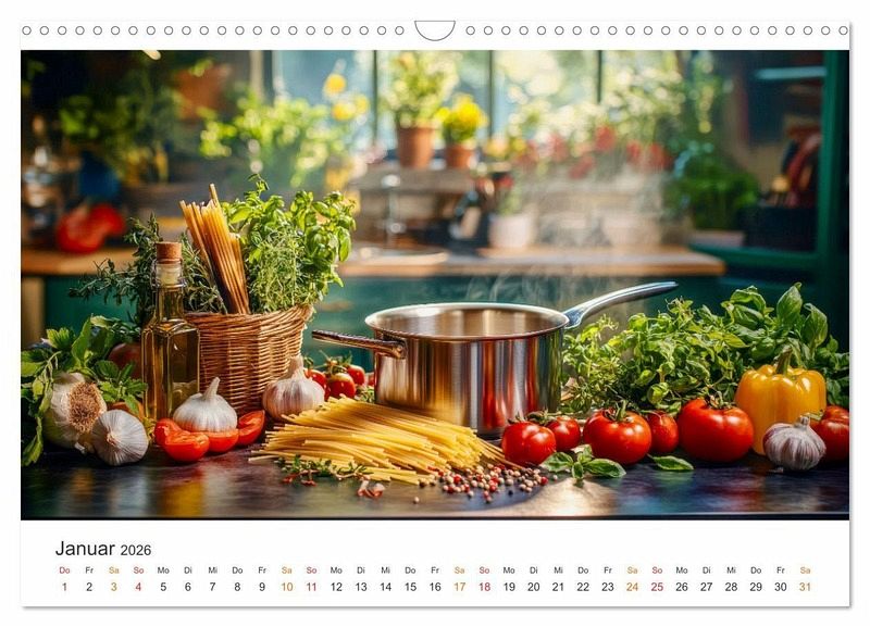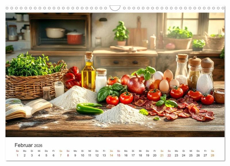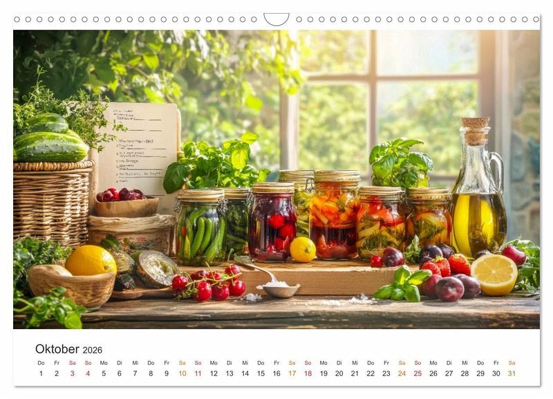 Willkommen in der vielfältigen Welt der Kulinarik mit diesem liebevoll gestalteten Küchenkalender. Jedes inspirierende KI-Bild zeigt eine wunderschön arrangierte Szene aus der Welt der Küche. Ob Gläser voller köstlich eingewecktem Gemüse, das an die Kunst des Haltbarmachens erinnert oder bunte Marmeladengläser, frisch in der heimischen Küche zubereitet. Sie sind ebenso ein Fest für Augen und Gaumen wie die vorbereiteten Zutaten für eine hausgemachte Pizza - liebevoll auf dem Küchentisch arrangiert. Jedes dieser zauberhaften Bilder macht Lust auf Kochen, Backen und Genießen. Perfekt als Geschenk für Hobbyköche, Foodies und alle, die ihre Küche mit einem besonderen Hingucker bereichern möchten.