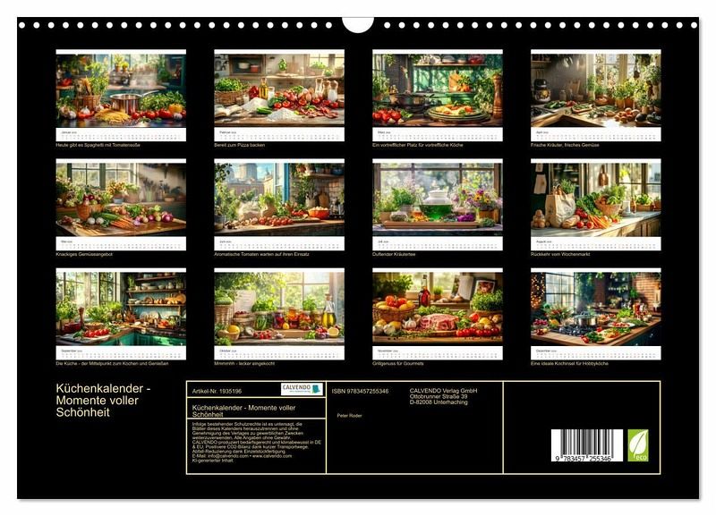 Willkommen in der vielfältigen Welt der Kulinarik mit diesem liebevoll gestalteten Küchenkalender. Jedes inspirierende KI-Bild zeigt eine wunderschön arrangierte Szene aus der Welt der Küche. Ob Gläser voller köstlich eingewecktem Gemüse, das an die Kunst des Haltbarmachens erinnert oder bunte Marmeladengläser, frisch in der heimischen Küche zubereitet. Sie sind ebenso ein Fest für Augen und Gaumen wie die vorbereiteten Zutaten für eine hausgemachte Pizza - liebevoll auf dem Küchentisch arrangiert. Jedes dieser zauberhaften Bilder macht Lust auf Kochen, Backen und Genießen. Perfekt als…mehr
