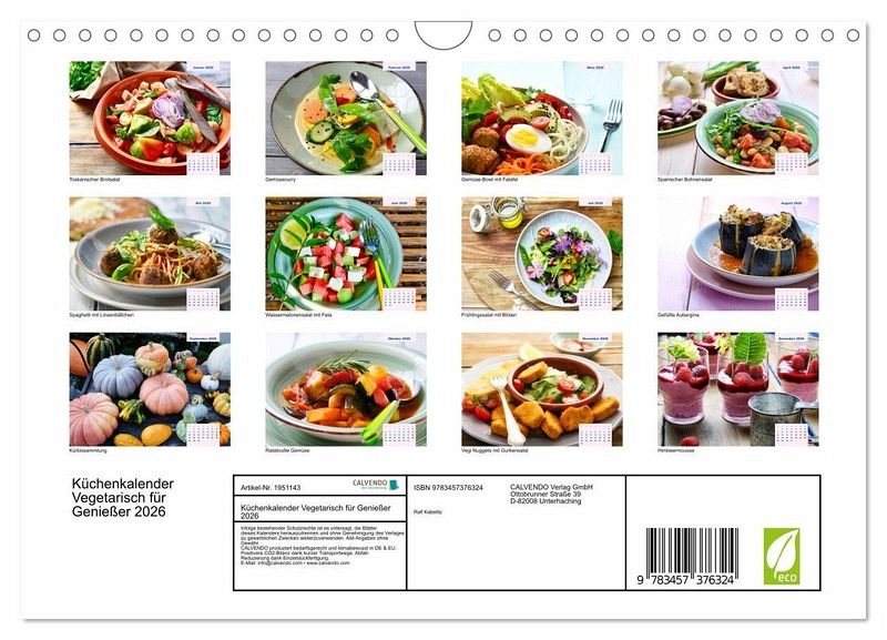 Ein Küchenkalender der vegetarischen Trendküche. 13 vegane und vegetarische Foodfotos der extraklasse vom Kochbuchautor und Küchenchef persönlich fotografiert. Ein Augenschmaus für jede Hobbyköchin bzw. Hobbykoch. Verschönert jede Küche im Handumdrehen.