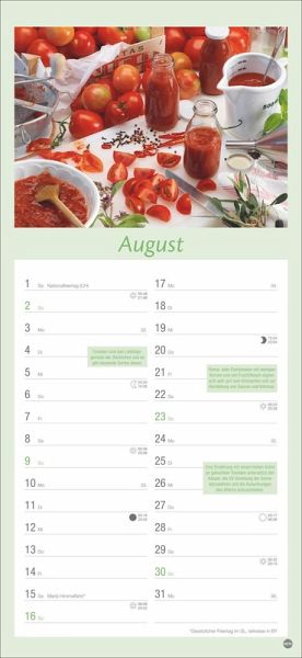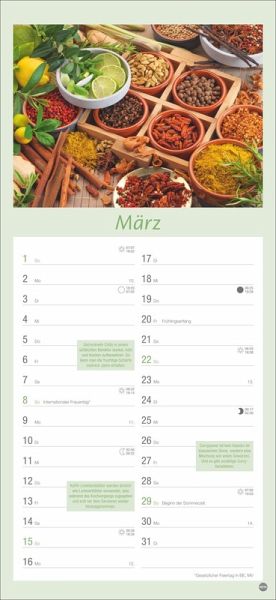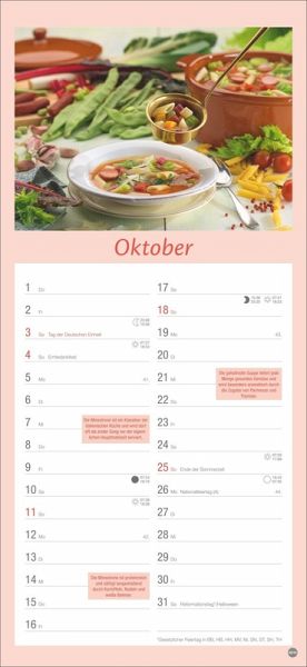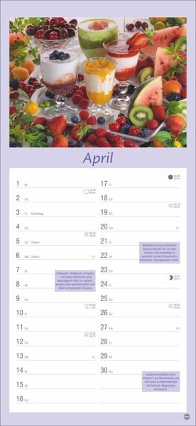 - Ein Küchenkalender, der Appetit auf mehr macht: Gleichzeitig planen und inspirieren lassen - Stimmungsvoller Wandkalender: Monat für Monat die schönsten Food-Fotos für Küche und Essbereich- Kalender im praktischen Langformat 16 x 34,7 cm, der mit viel Platz für Eintragungen punktet- Ein Küchenfotokalender mit dem gewissen Extra: Enthält nützliche Tipps rund um die Themen Kochen und Haushalt- Unendliche Themenvielfalt in allen Formaten: Die Wandplaner von Heye aus dem Athesia Kalenderverlag