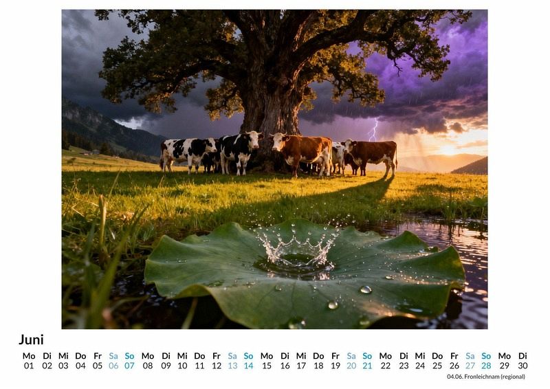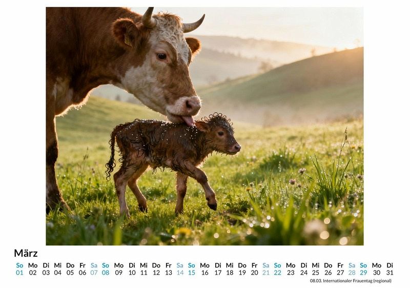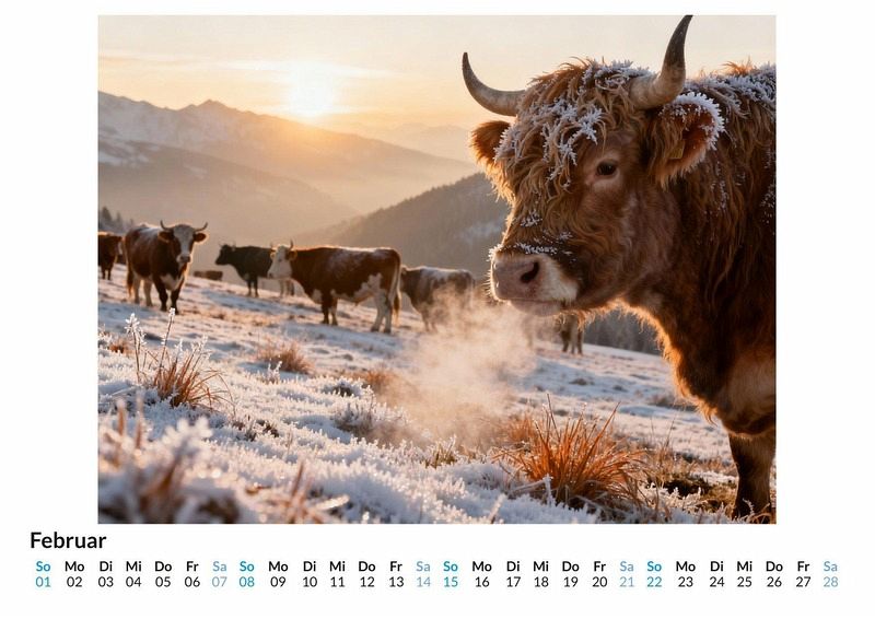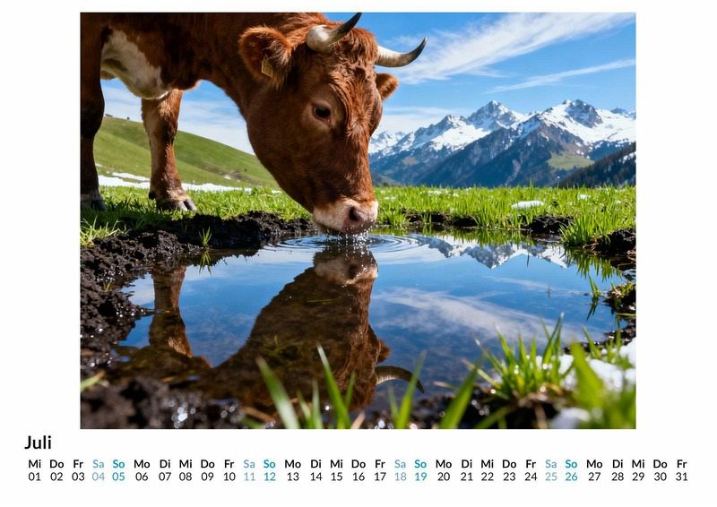 Stille liegt über den saftigen Wiesen, nur unterbrochen vom leisen Klingen der Kuhglocken und dem zufriedenen Kauen der Herde. Der Kalender "Kühe auf der Weide" fängt diese Momente der Ruhe und Natürlichkeit ein und bringt die Gelassenheit des Landlebens in den Alltag. Jedes Monatsblatt ist eine Hommage an die sanften Riesen und die unberührte Landschaft, die sie ihr Zuhause nennen. Dieser Kalender ist eine gute Wahl: * Für Liebhaber von Natur und ländlicher Idylle. * Für Menschen, die sich nach Entschleunigung im Alltag sehnen. * Für alle, die ihre Räume mit friedvollen Motiven gestalten möchten. Monat für Monat entfalten sich Szenen voller Harmonie. Kühe grasen im sanften Licht der Morgensonne, ruhen im Schatten alter Bäume oder blicken neugierig in die Ferne. Die Motive, entstanden durch die kreative Interpretation digitaler Prozesse, zeigen die Tiere in einer idealisierten und doch vertrauten Umgebung. Jedes Bild ist eine Komposition aus Licht, Landschaft und der ruhigen Präsenz der Herde, die eine friedliche Stimmung verbreitet. Mit dem Kauf dieses Kalenders kann man Folgendes erwarten: * Zwölf Monatsbilder, die idyllische Weideszenen zeigen. * Ein klares Kalendarium für die Planung des Jahres. * Ein dekorativer Begleiter durch die Jahreszeiten. Der Kalender "Kühe auf der Weide" ist eine Einladung, die beruhigende Kraft der Natur in den eigenen vier Wänden zu erleben. Die Sammlung der zwölf Motive bietet eine visuelle Pause und begleitet mit stiller Anmut durch das Jahr. Es lohnt sich, einen Blick auf die einzelnen Monatsblätter zu werfen.