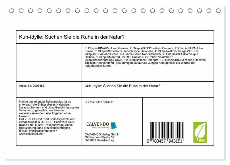 QUALITÄT - Hochwertiger Fotokalender mit 12 wunderschönen Motiven auf lichtbeständigem Bilderdruckpapier, robuste Spiralbindung.NACHHALTIG - deutliche Abfallreduzierung durch bedarfsgerechte Einzelstückfertigung, umweltfreundliches FSC-zertifiziertes Papier, Produktion in Deutschland, klimabewusste Logistik.PERFEKTES GESCHENK - Kalender für Freunde und Familie, für Kinder und Erwachsene, jung und alt, zu Weihnachten, Geburtstag oder zwischendurch.VIELFALT - Bildkalender in verschiedenen Formaten, z.B. DIN A5, DIN A4, DIN A3 sowie DIN A2. Ob Naturmotiv, Gemälde oder Fotos, ideal für ein persönliches Wohlfühlambiente.Nehmen Sie sich eine kleine Auszeit und betrachten Sie Kühe auf den Weiden. von Autor(in): CALVENDO Verlag