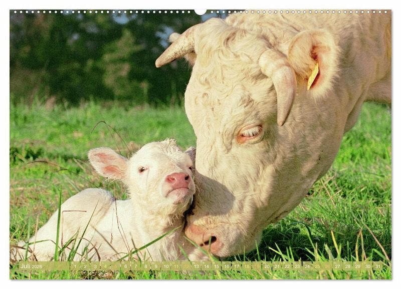 Juli: Kuh kümmert sich liebevoll um ihr neugeborenes Kälbchen der Rasse Charolais auf einer Wiese