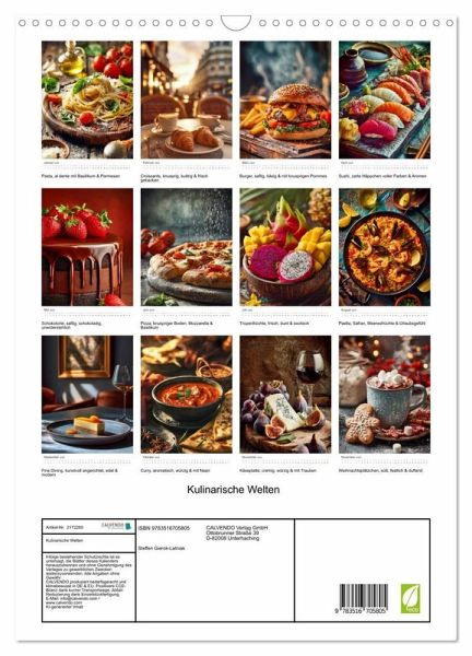 Ein Jahr voller Genussmomente, zum Anbeißen schön! Tauche Monat für Monat in die Welt der Kulinarik ein. Knusprige Croissants zum Frühstück, cremige Cappuccinos für die Seele, aromatische Currys voller Gewürze oder süße Schokotorten, die jedes Herz höher schlagen lassen. Dieser liebevoll gestaltete Kalender ist mehr als nur ein Blickfang - er ist eine tägliche Einladung, den Zauber des Essens zu feiern. Ob für deine Küche, dein Esszimmer oder als Geschenk für einen lieben Menschen, dieser Kalender macht Appetit auf mehr. Alle hier gezeigten Bilder wurden mit Sorgfalt, Liebe und mit Hilfe einer KI generiert. Abschließend werden sie mit Bildbearbeitungsprogrammen überarbeitet und in den Kalender eingefügt.