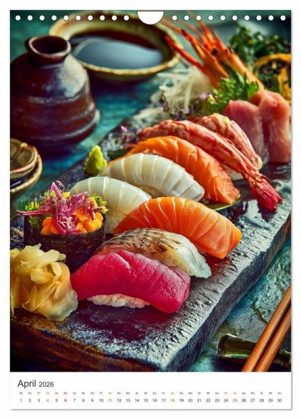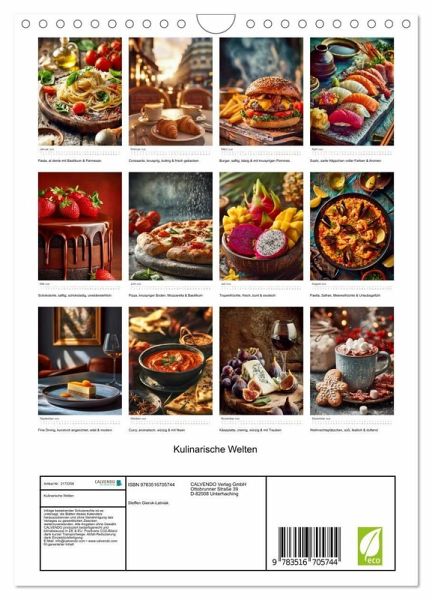 Ein Jahr voller Genussmomente, zum Anbeißen schön! Tauche Monat für Monat in die Welt der Kulinarik ein. Knusprige Croissants zum Frühstück, cremige Cappuccinos für die Seele, aromatische Currys voller Gewürze oder süße Schokotorten, die jedes Herz höher schlagen lassen. Dieser liebevoll gestaltete Kalender ist mehr als nur ein Blickfang - er ist eine tägliche Einladung, den Zauber des Essens zu feiern. Ob für deine Küche, dein Esszimmer oder als Geschenk für einen lieben Menschen, dieser Kalender macht Appetit auf mehr. Alle hier gezeigten Bilder wurden mit Sorgfalt, Liebe und mit Hilfe einer KI generiert. Abschließend werden sie mit Bildbearbeitungsprogrammen überarbeitet und in den Kalender eingefügt.