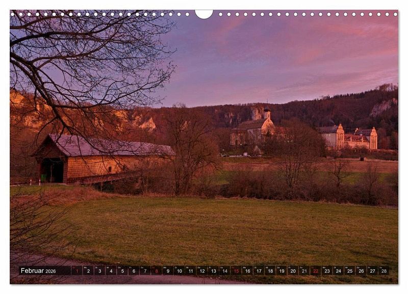 Februar: Abendstimmung über Beuron, mit Erzabtei St. Martin und der Holzbrücke von 1803