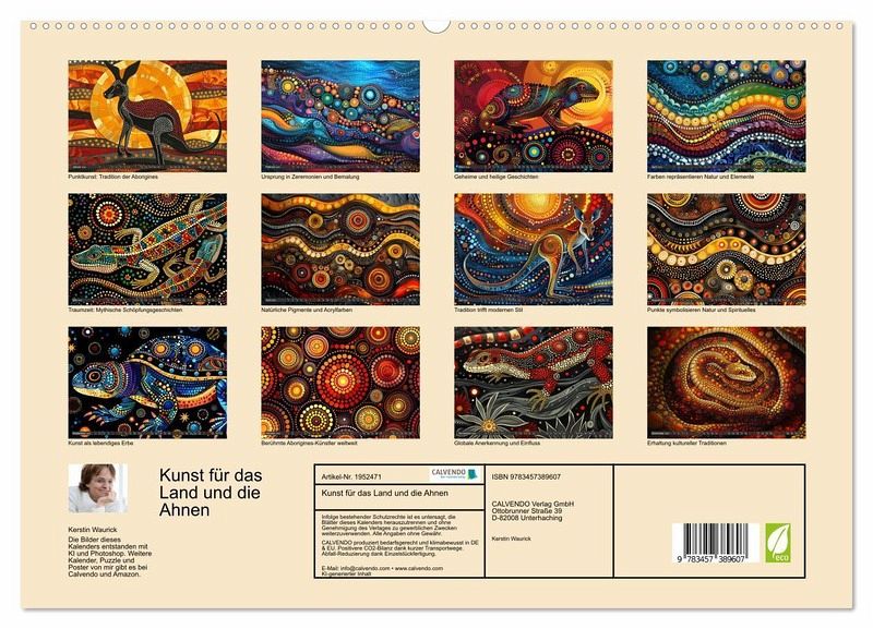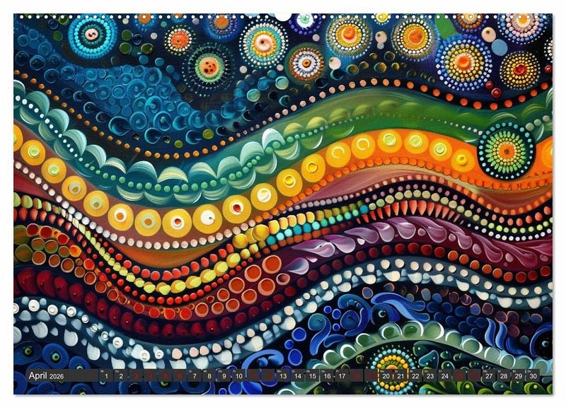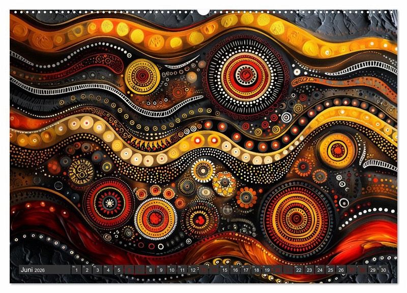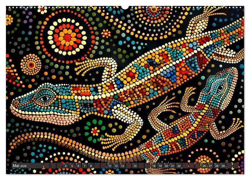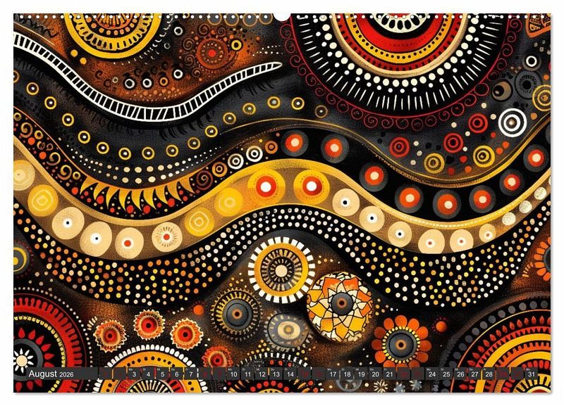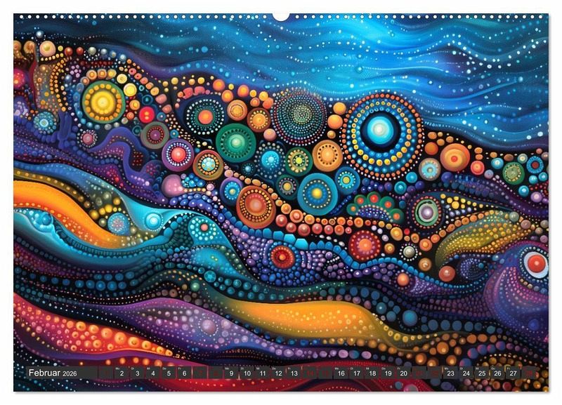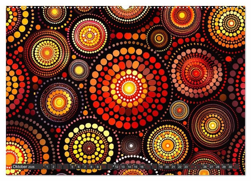 Unser einzigartiger Kalender bringt die faszinierende Welt der traditionellen Aborigines-Kunst zu Ihnen nach Hause. Punktkunst, auch bekannt als Dot Painting, hat ihre Wurzeln in den alten Zeremonien und Körperbemalungen der australischen Ureinwohner. Diese Kunstform erzählt geheime und heilige Geschichten aus der Traumzeit, der mythischen Schöpfungsperiode der Aborigines.
