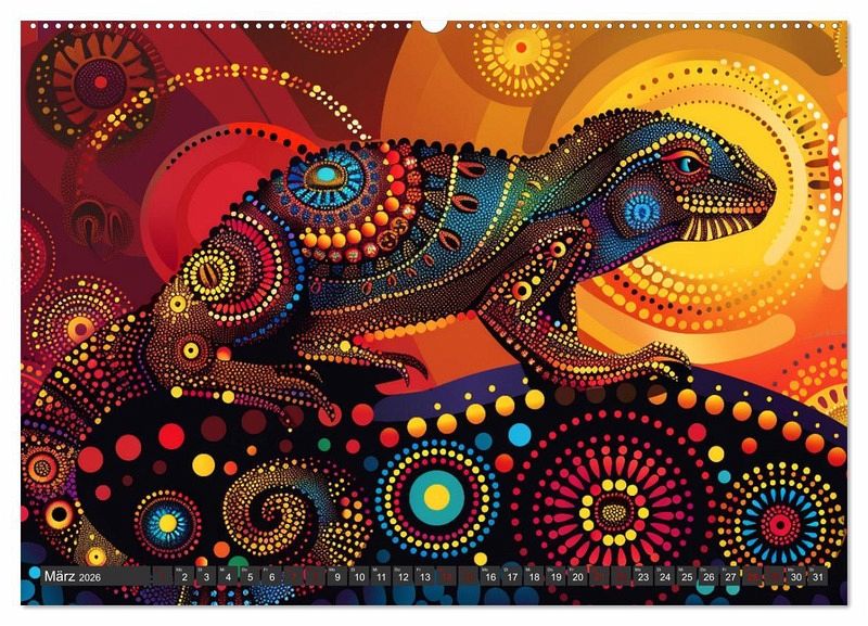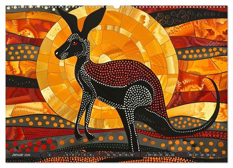 Jedes Kalenderblatt präsentiert atemberaubende, von KI generierte Kunstwerke, die traditionelle Techniken mit modernen Stilen und Materialien kombinieren. Lassen Sie sich von den lebendigen Farben und der tiefen Symbolik verzaubern und tauchen Sie ein in die spirituelle Welt der Aborigines-Kultur.