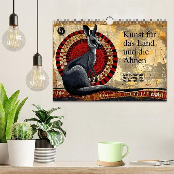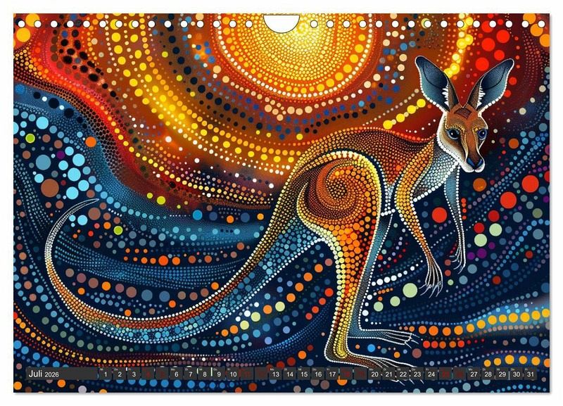Jedes Kalenderblatt präsentiert atemberaubende, von KI generierte Kunstwerke, die traditionelle Techniken mit modernen Stilen und Materialien kombinieren. Lassen Sie sich von den lebendigen Farben und der tiefen Symbolik verzaubern und tauchen Sie ein in die spirituelle Welt der Aborigines-Kultur.