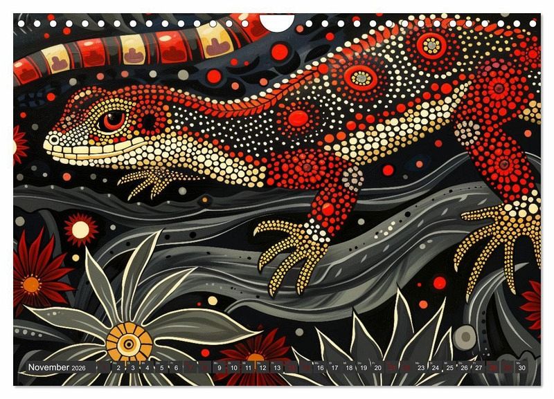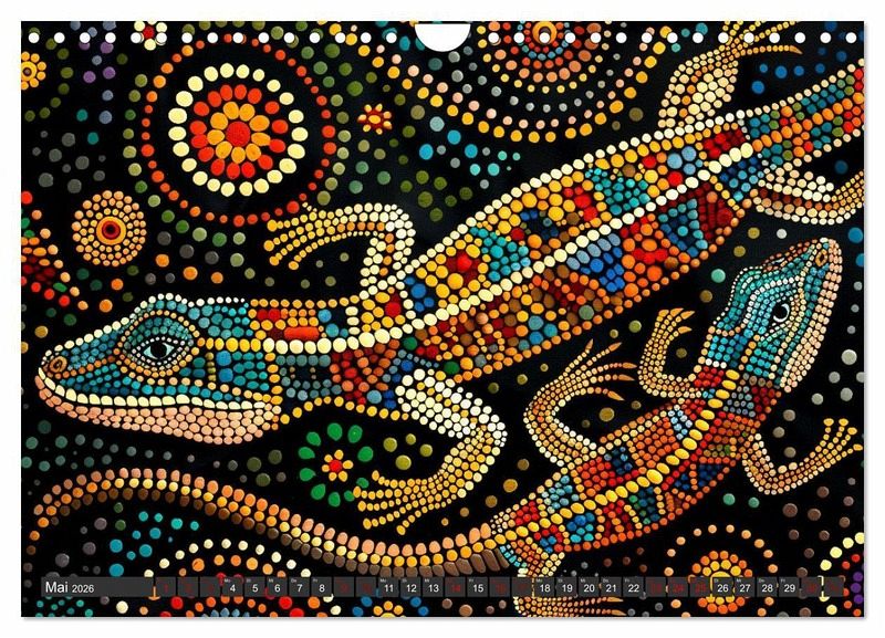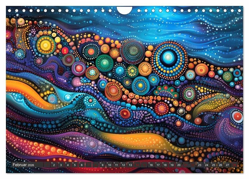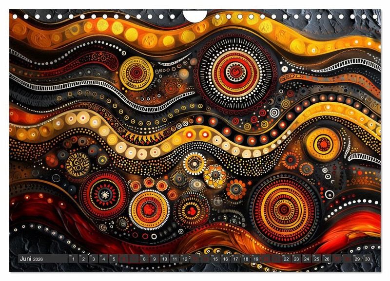 Unser einzigartiger Kalender bringt die faszinierende Welt der traditionellen Aborigines-Kunst zu Ihnen nach Hause. Punktkunst, auch bekannt als Dot Painting, hat ihre Wurzeln in den alten Zeremonien und Körperbemalungen der australischen Ureinwohner. Diese Kunstform erzählt geheime und heilige Geschichten aus der Traumzeit, der mythischen Schöpfungsperiode der Aborigines.