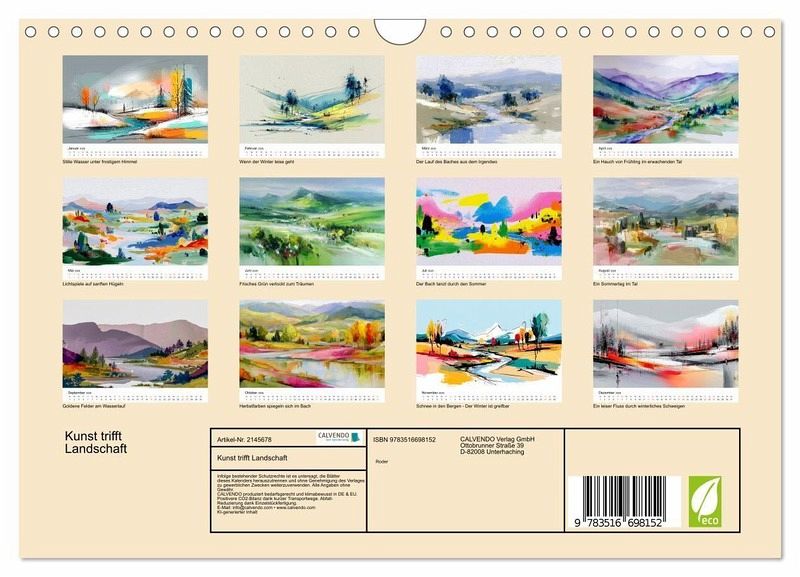 Lassen Sie sich einladen zu einer visuellen Reise durch das Jahr - begleitet von einem Bach, der sich wie ein roter Faden durch jede Szene schlängelt. Zwölf Landschaftsgemälde, von Öl bis Aquarell, zeigen die Natur in all ihrer Vielfalt und Tiefe und offenbaren jeweils einen neuen Blickwinkel: mal kräftig und expressiv, mal zart und atmosphärisch. Und auch die wechselnden Jahreszeiten spiegeln sich in Farben, Licht und Stimmung wider. Gestaltet mit dem Auge fürs Detail verschmelzen diese Bilder in eine Welt von Kunst und Natur, wobei die grafische Umsetzung im Zusammenspiel klassischer Gestaltung und ausgewählter KI-basierter Methoden erfolgte. Ein Kalender für Kunstliebhaber, Naturschwärmer und alle, die sich jeden Monat aufs Neue inspirieren lassen möchten.