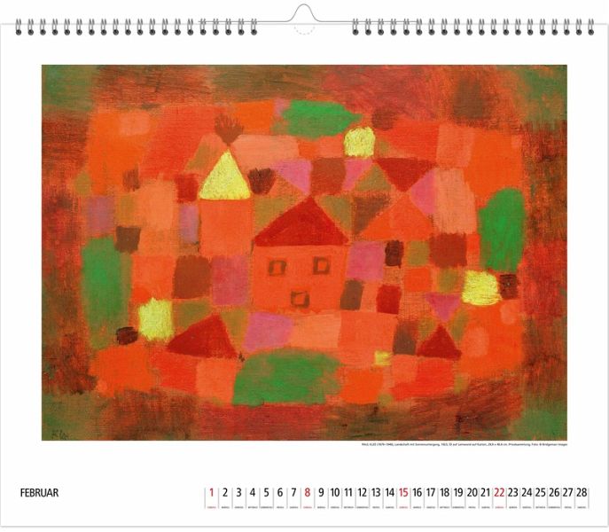 Jeden Monat ein berühmtes Kunstwerk der klassischen Moderne Hochwertige Druckqualität für brillante Farben und Details Dekorativer Wandschmuck für Zuhause, Büro oder Atelier Kunstdrucke lassen sich perfekt einrahmen und dauerhaft nutzen Ein ideales Geschenk für Kunstliebhaber Januar: Paul Signac: Der Schnee, 1886 Februar: Paul Klee: Landschaft mit Sonnenuntergang, 1923 März: Andre Derain: Big Ben, London 1906 - auch Cover April: Pierre Bonnard: Das Frühstück, 1932 Mai: August Macke: Promenade, 1913 Juni: Henri Matisse: Ananas und Anemonen, 1940 Juli: Max Liebermann: Gartencafé am Wannsee, 1920er Jahre August: Franz Marc: Fuchs, 1911 September: Wassily Kandinsky: Häuser in München, 1908 Oktober: Paul Cézanne: Stillleben mit Suppenterrine, 1877 November: Vincent van Gogh: Sternennacht, Saint Rémy, 1889 Dezember: Ernst Ludwig Kirchner: Schlittschuhläufer, 1924