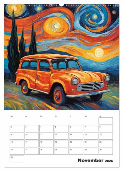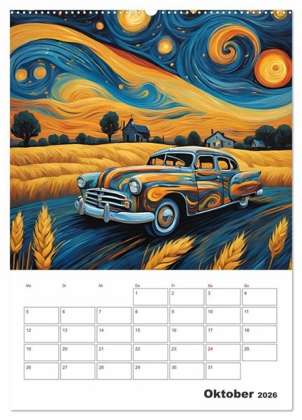 Lassen Sie sich von der Schönheit der Oldtimer verzaubern, während Sie durch das Jahr reisen. Die Kombination aus nostalgischen Automobilen und der unverwechselbaren Kunst von van Gogh schafft eine harmonische Symbiose, die sowohl Autoenthusiasten als auch Kunstliebhaber begeistern wird.