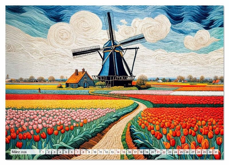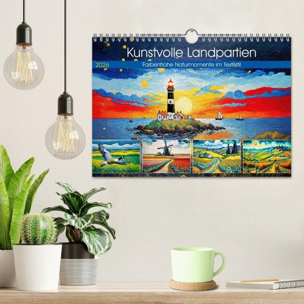Entdecken Sie mit dem Kalender "Kunstvolle Landpartien - Farbenfrohe Naturmomente im Textilstil" ein ganzes Jahr voller traumhafter Landschaftsimpressionen. Von malerischen Küsten über blühende Felder bis hin zu idyllischen Landwegen - jedes Monatsmotiv erstrahlt in lebendigen Farben und kunstvoller KI-generierter Textiloptik. Die einzigartigen Bilder erinnern an Stickerei, Patchwork und kreative Handarbeit und bringen Wärme und Harmonie in Ihr Zuhause. Ideal für Natur- und Kunstliebhaber, als Geschenk oder zur stilvollen Wanddekoration.