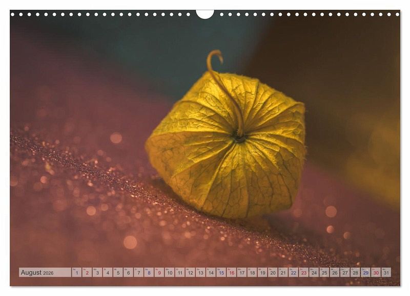 Die getrockneten Fruchthüllen der Physalis, auch Lampionblume genannt, gehören zu den Lieblingsmotiven der Fotografin. In diesem Kalender zeigt sie die Vielseitigkeit dieser außergewöhnlichen und dekorativen Frucht in stimmungsvollen Bildern. Die Schale der Physalis ist ein richtiger Blickfang. Wer sich auch von den kleinen Dingen der Natur, wie hier faszinierend festgehalten, begeistern lässt und wem die Abwechslung liegt, der wird an diesem Kalender viel Freude haben.