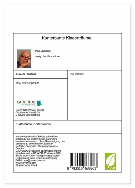 QUALITÄT - Hochwertiger Fotokalender mit 12 wunderschönen Motiven auf lichtbeständigem Bilderdruckpapier, robuste Spiralbindung.NACHHALTIG - deutliche Abfallreduzierung durch bedarfsgerechte Einzelstückfertigung, umweltfreundliches FSC-zertifiziertes Papier, Produktion in Deutschland, klimabewusste Logistik.PERFEKTES GESCHENK - Kalender für Freunde und Familie, für Kinder und Erwachsene, jung und alt, zu Weihnachten, Geburtstag oder zwischendurch.VIELFALT - Bildkalender in verschiedenen Formaten, z.B. DIN A5, DIN A4, DIN A3 sowie DIN A2. Ob Naturmotiv, Gemälde oder Fotos, ideal für ein persönliches Wohlfühlambiente.Wo Kinderlachen bunt wird - 12 Monate zum Staunen von Autor(in): Paul Michalzik