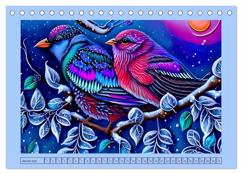 Erleben Sie die faszinierende Welt der Fantasievögel. Farbenfrohe Vogelillustrationen begeistern und zeigen Kunst auf eine neue Art und Weise. Alle Bilder sind digitale Gemälde, die nach handgemalten Vorlagen mit KI modifiziert und mit zahlreichen Bildbearbeitungsprogrammen zu einem harmonischen Ganzen komponiert wurden. Ideal für Vogelfans und Kunstliebhaber als Geschenk. Jetzt bestellen und jeden Monat eine neue Überraschung genießen.