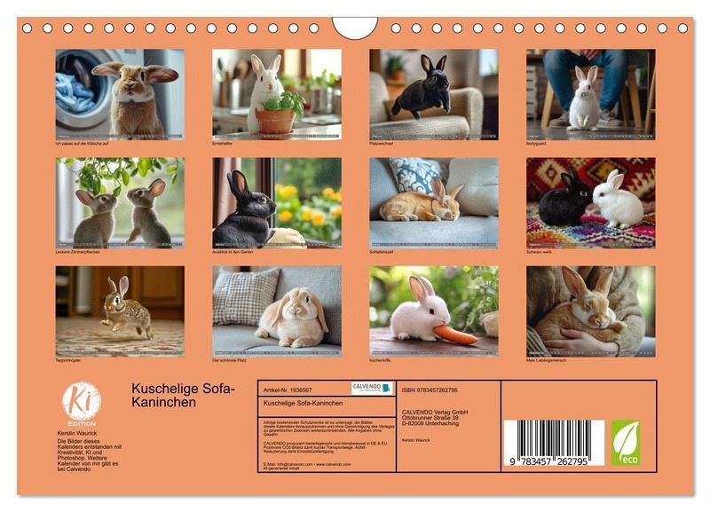 "Kuschelige Sofa-Kaninchen" ist der perfekte Kalender für alle, die ihre Liebe zu Hauskaninchen mit stilvollen und herzerwärmenden Bildern feiern möchten. Mit einer einzigartigen Mischung aus fotorealistischen KI-generierten Motiven zeigt er die flauschigen Langohren in ihren gemütlichsten Momenten - auf Sofas, in Kissen gekuschelt oder entspannt im Wohnzimmer. Jeder Monat bringt ein neues, liebevoll gestaltetes Bild, das die sanfte und verspielte Natur der Kaninchen einfängt. Ein Muss für Kaninchenfreunde und alle, die sich an flauschiger Gemütlichkeit erfreuen.