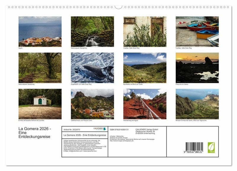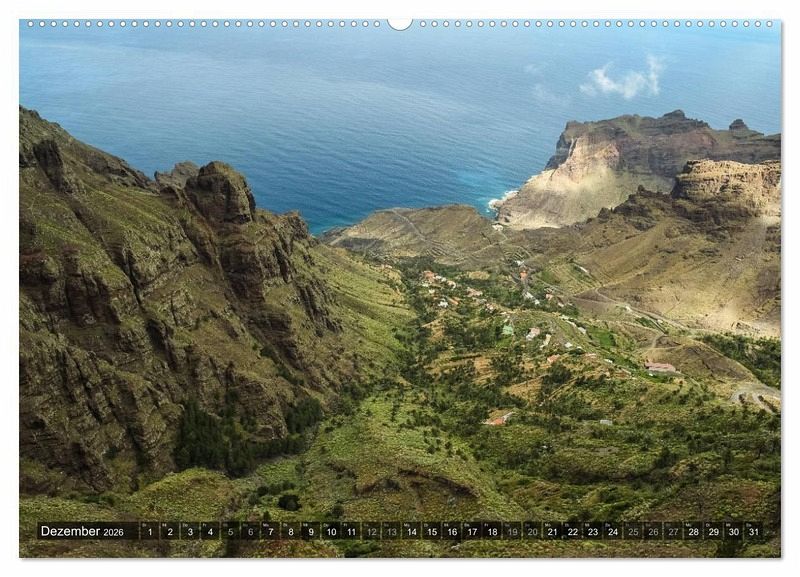 LA GOMERA ist zwar die zweitkleinste Kanareninsel, dafür aber sicherlich eine der abwechslungsreichsten. Immergrüne Nebelwälder in den Höhenlagen, schwarze Strände an den Küsten, dazwischen schmiegen sich farbenfrohe Dörfer an schroffe Vulkanschlote und Steilwände. Dieses Naturparadies lädt zum Wandern, Verweilen und Entspannen ein - der Kalender holt diese Eindrücke ins heimische Wohnzimmer.
