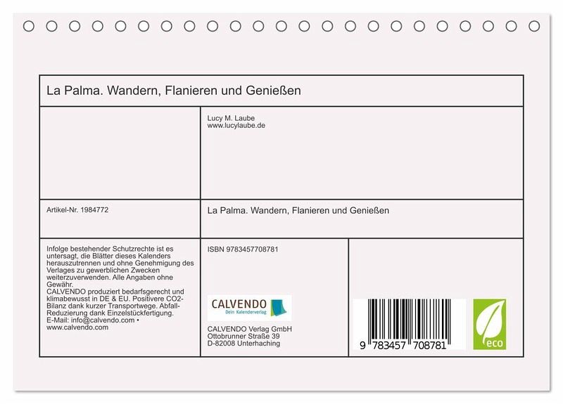 QUALITÄT - Hochwertiger Fotokalender mit 12 wunderschönen Motiven auf lichtbeständigem Bilderdruckpapier, robuste Spiralbindung.NACHHALTIG - deutliche Abfallreduzierung durch bedarfsgerechte Einzelstückfertigung, umweltfreundliches FSC-zertifiziertes Papier, Produktion in Deutschland, klimabewusste Logistik.PERFEKTES GESCHENK - Kalender für Freunde und Familie, für Kinder und Erwachsene, jung und alt, zu Weihnachten, Geburtstag oder zwischendurch.VIELFALT - Bildkalender in verschiedenen Formaten, z.B. DIN A5, DIN A4, DIN A3 sowie DIN A2. Ob Naturmotiv, Gemälde oder Fotos, ideal für ein persönliches Wohlfühlambiente.Die geologisch jüngste und waldreichste Kanarische Insel von Autor(in): Lucy M. Laube