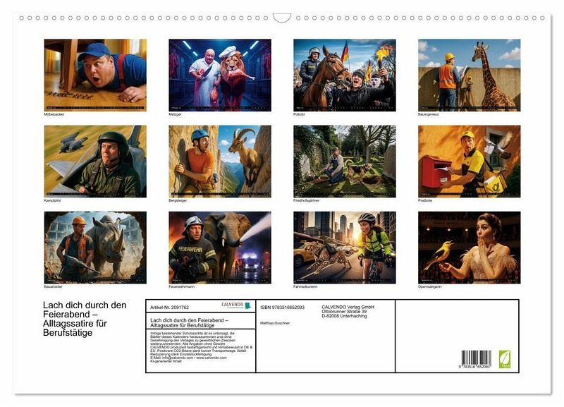 Lach dich durch den Feierabend - Alltagssatire für Berufstätige Der tierisch beste Kalender des Jahres! Wenn der Büroalltag mal wieder schwer auf den Schultern liegt, kommt dieser Kalender wie gerufen: Mit bissigem Humor, überraschenden Fotomontagen und einem Augenzwinkern zeigt er Monat für Monat, wie Tiere uns im Job lässig die Show stehlen. Ob Gepard statt Kurier, Elefant im Feuerwehreinsatz oder Nashorn auf der Baustelle - hier wird der tägliche Arbeitswahnsinn charmant aufs Korn genommen. Für alle, die morgens den Wecker hassen, tagsüber funktionieren müssen und abends trotzdem lachen…mehr