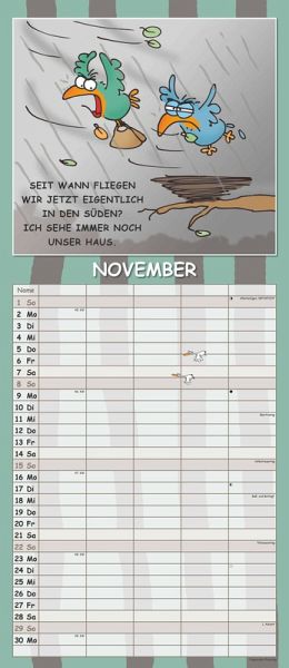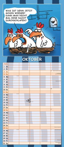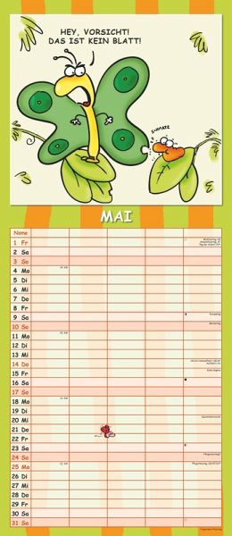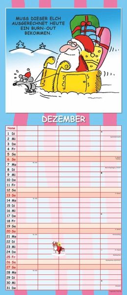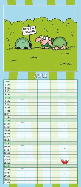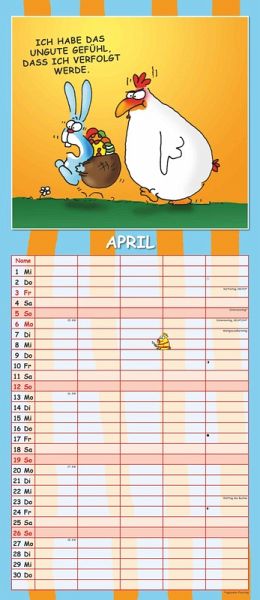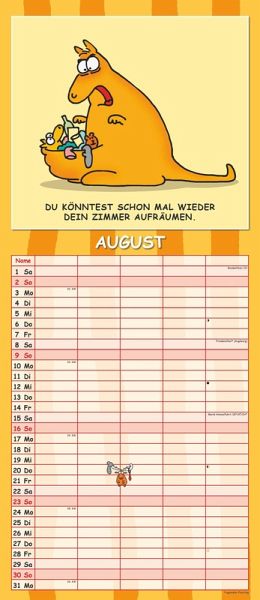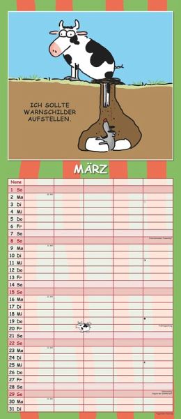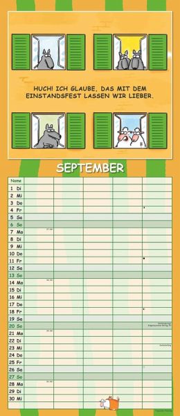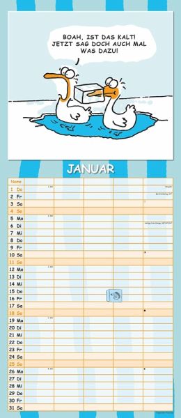 Ob der gemeinsame Shopping-Tag, der nächste Spieleabend oder der Schulausflug der Kinder - dank des Familienplaners Lach mal wieder und seinen fünf übersichtlichen Spalten haben Sie alle Termine Ihrer Familie stets im Blick. Das Besondere an diesem Familienkalender sind die zwölf lustigen Cartoons von Alexander Holzach, die Sie und Ihre Lieben jeden Monat wieder köstlich amüsieren werden. Lassen Sie sich jeden Monat von einer neuen, witzigen Illustration überraschen, in der drollige Tiere mit charmantem Witz zu Wort kommen.